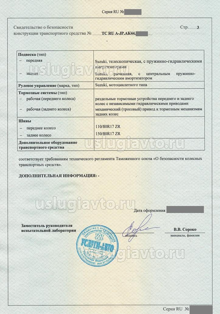 Пример оформления свидетельства о безопасности конструкции транспортного средства (СБКТС) для ввозного мотоцикла.