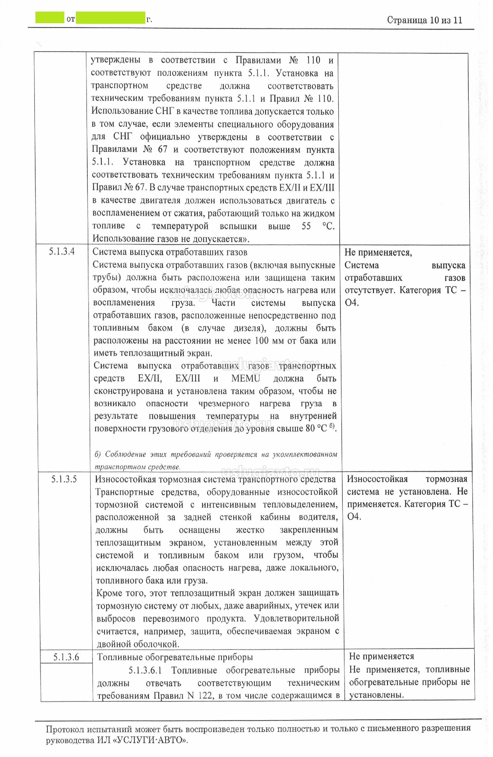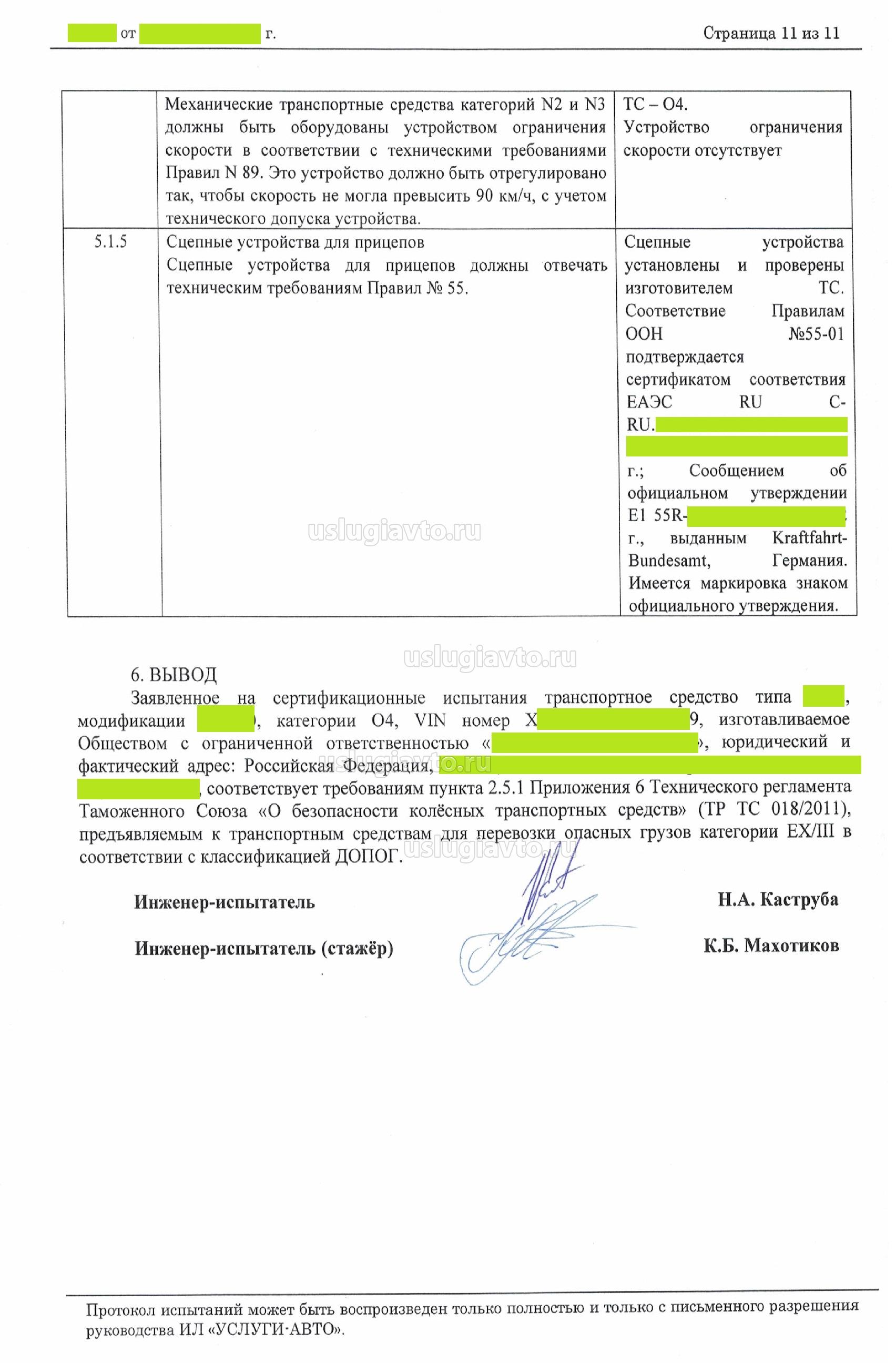 ПРОТОКОЛ сертификационных испытаний транспортного средства (полуприцеп фургон категории О4) для перевозки опасных грузов категории EX/III в соответствии с классификацией ДОПОГ в отношении требований технического регламента Таможенного союза «О безопасности колесных транспортных средств» ТР ТС 018/2011 (подпункт 2.5.1 Приложения № 6 - Правила ООН №105-04 «ЕДИНООБРАЗНЫЕ ПРЕДПИСАНИЯ, КАСАЮЩИЕСЯ ОФИЦИАЛЬНОГО УТВЕРЖДЕНИЯ ТРАНСПОРТНЫХ СРЕДСТВ, ПРЕДНАЗНАЧЕННЫХ ДЛЯ ПЕРЕВОЗКИ ОПАСНЫХ ГРУЗОВ, В ОТНОШЕНИИ ИХ КОНСТРУКТИВНЫХ ОСОБЕННОСТЕЙ»)