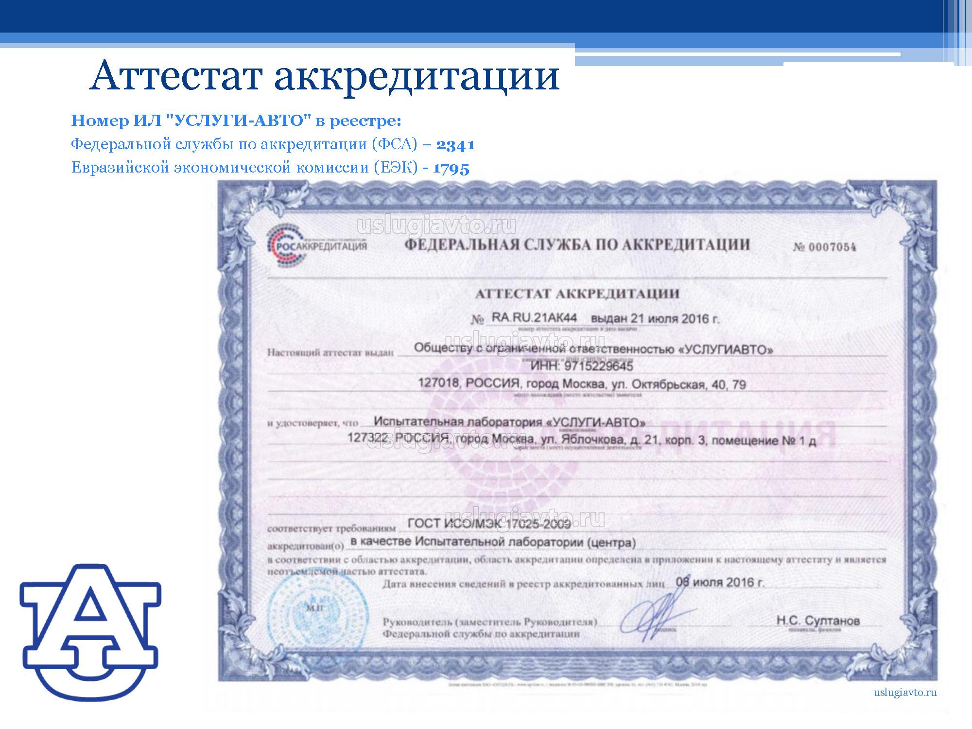 Информация об Испытательной лаборатории "УСЛУГИ-АВТО" АТТЕСТАТ АККРЕДИТАЦИИ RA.RU.21AK44 от 8 июля 2016 года бессрочного срока действия