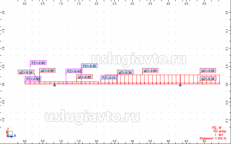 Балка нагружается сосредоточенными и распределенными по длине силами, соответствующими подрессоренным массам установленных на раме агрегатов, кабины, платформы, экипажа и груза до значения нагрузок на оси от полной массы за вычетом неподрессоренных масс. Опоры балки соответствуют центрам колес автомобиля. Расчетная схема показана на Рисунке 4.