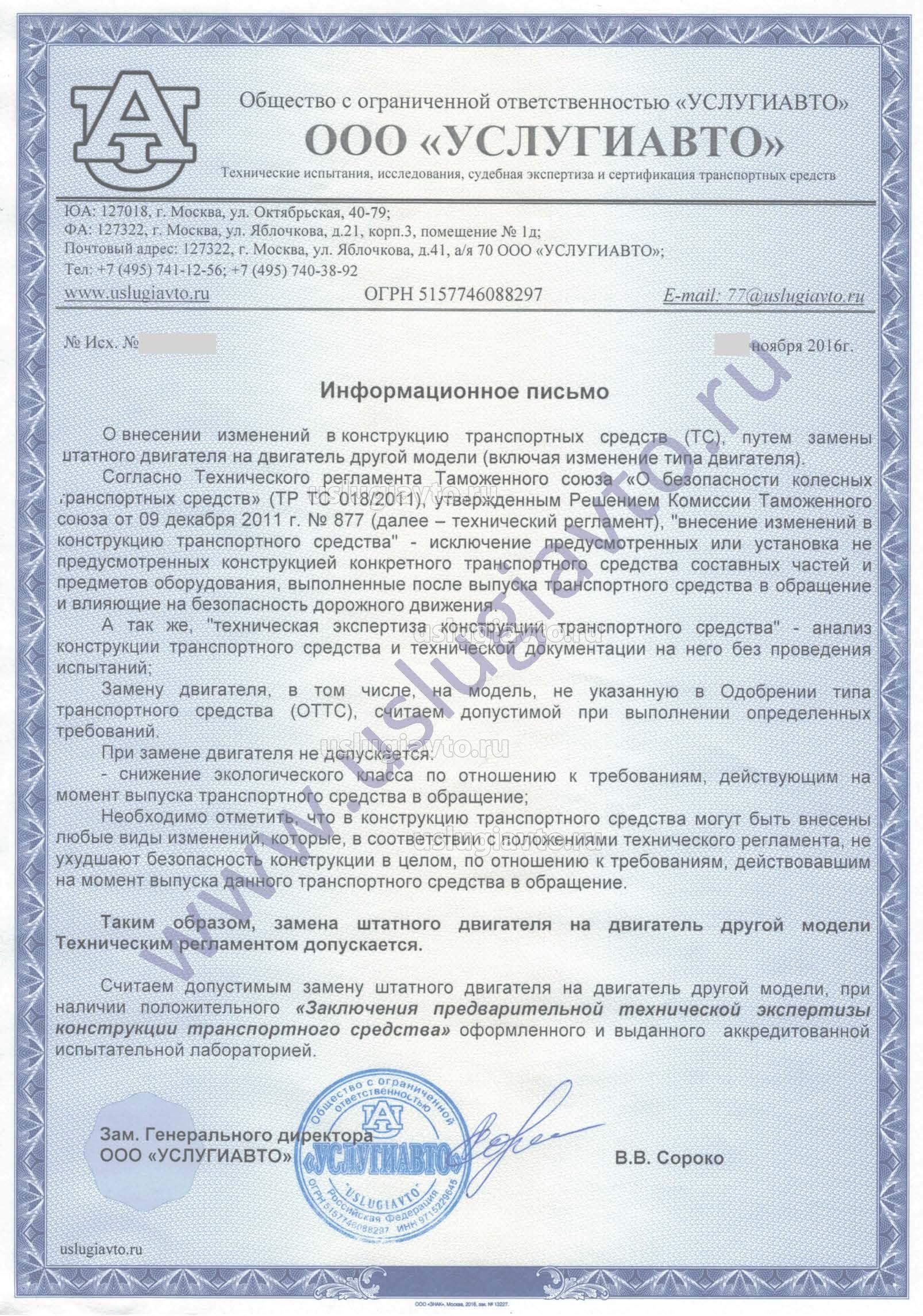 Считаем допустимым замену штатного двигателя на двигатель другой модели, при наличии положительного «Заключения предварительной технической экспертизы конструкции транспортного средства» оформленного и выданного аккредитованной испытательной лабораторией.