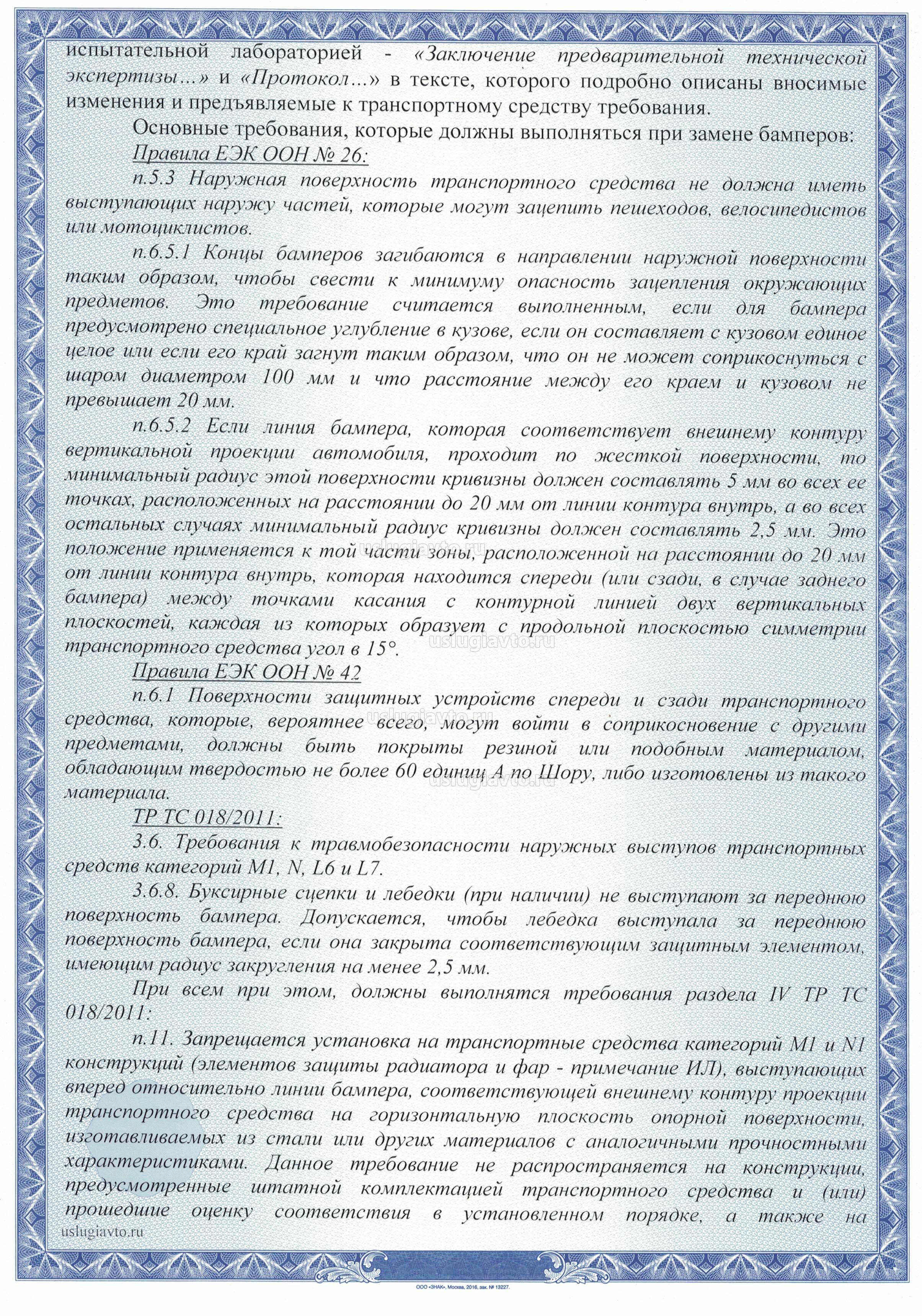 В настоящее время собственники транспортных средств в массовом порядке легализуют установленные на транспортных средствах усиленные бампера («кенгурятники»), различного рода трубы, устанавливаемые под штатный бампер транспортного средства, лебедки, экспедиционные багажники, колеса повышенного диаметра, и прочее дополнительное оборудование (шноркель, тросики от передних стоек до капота, подножки, расширители колесных арок и др.), а также увеличение дорожного просвета, путем установки проставок. На указанное оборудование, согласно приложения № 10 Технического регламента о безопасности колесных транспортных средств ТР ТС 018/2011, требование прохождение сертификации продукции не распространяется. Одновременно с этим, пунктом 10.8. ТР ТС 018/2011 не допускается деформация вследствие повреждений или изменение конструкции передних и задних бамперов транспортных средств категорий М и N, при которых радиус кривизны выступающих наружу частей бампера (за исключением деталей, изготовленных из неметаллических эластичных материалов) менее 5 мм;