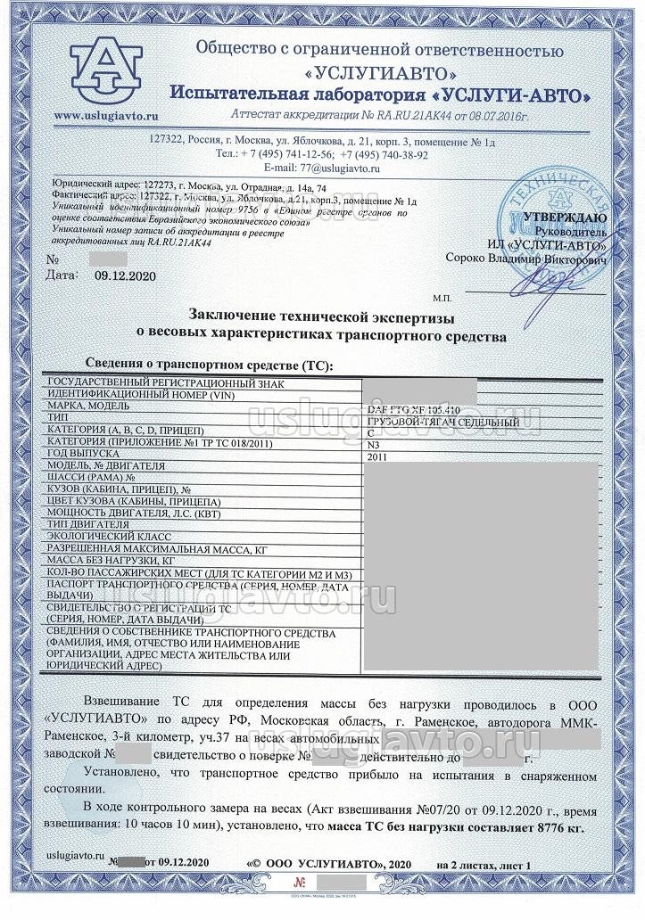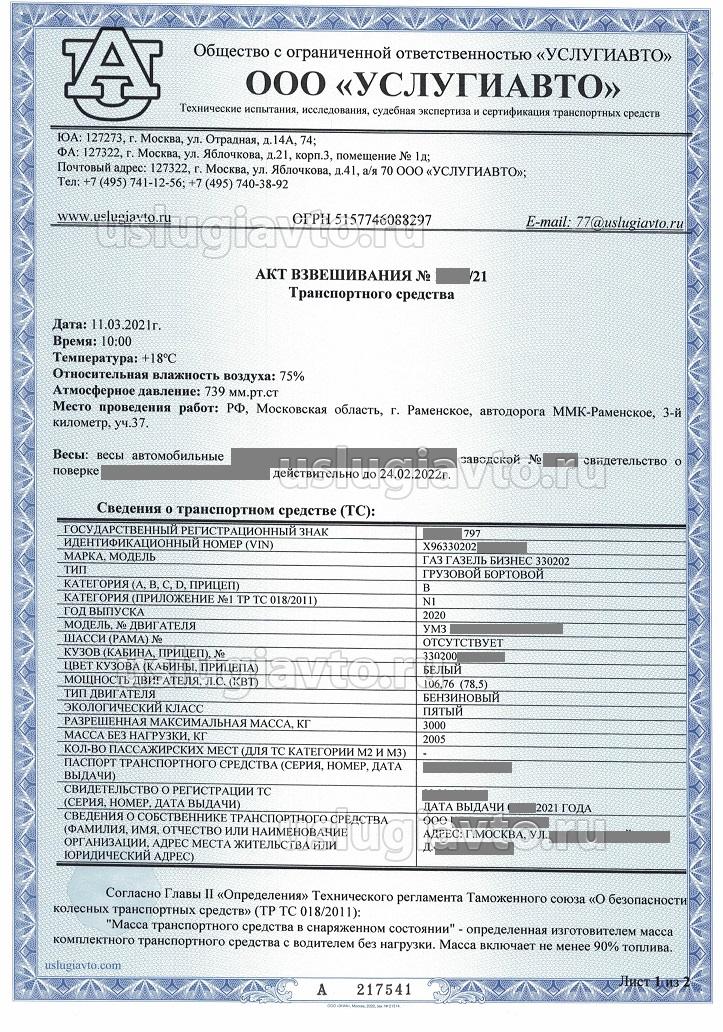 Процедура внесения реальной снаряженной массы ТС в ПТС:1. Взвешивание ТС проводится на поверенных весах в испытательной лаборатории «УСЛУГИ-АВТО» по ГОСТ 33987-2016 «Транспортные средства колесные. Массы и размеры. Технические требования и методы определения» с оформлением акта взвешивания.