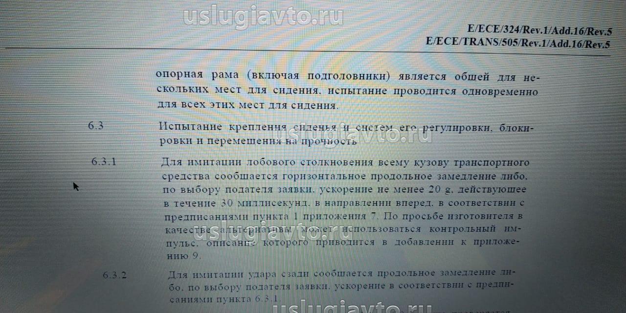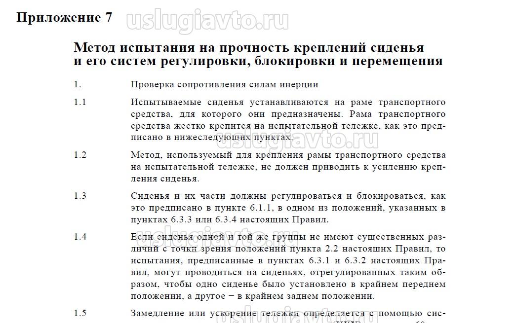 Требования к испытаниям сидений описаны в п.6 и Приложении 7 Правил ООН №17.