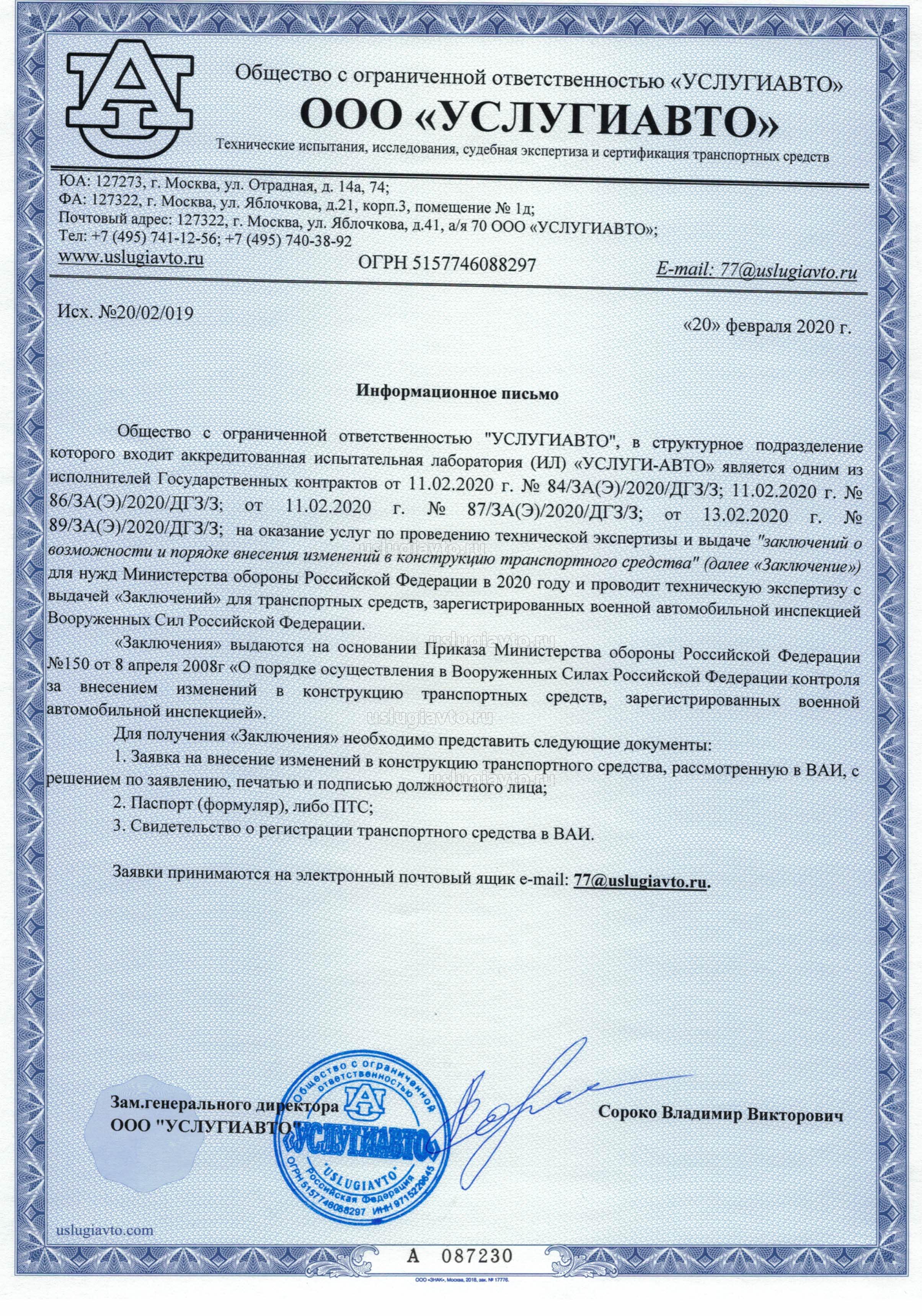 Общество с ограниченной ответственностью "УСЛУГИАВТО", в структурное подразделение которого входит аккредитованная испытательная лаборатория (ИЛ) «УСЛУГИ-АВТО» является одним из исполнителей Государственных контрактов от 11.02.2020 г. № 84/ЗА(Э)/2020/ДГЗ/З; 11.02.2020 г. № 86/ЗА(Э)/2020/ДГЗ/З; от 11.02.2020 г. № 87/ЗА(Э)/2020/ДГЗ/З; от 13.02.2020 г. № 89/ЗА(Э)/2020/ДГЗ/З; на оказание услуг по проведению технической экспертизы и выдаче "заключений о возможности и порядке внесения изменений в конструкцию транспортного средства" (далее «Заключение») для нужд Министерства обороны Российской Федерации в 2020 году и проводит техническую экспертизу с выдачей «Заключений» для транспортных средств, зарегистрированных военной автомобильной инспекцией Вооруженных Сил Российской Федерации.