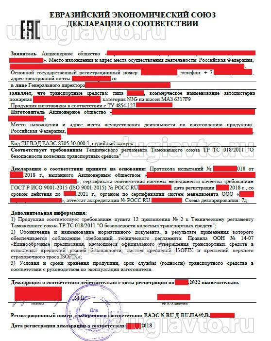 Орган по сертификации "У-АВТО" регистрирует декларации соответствия в Федеральной Государственной информационной системе (ФГИС) Росаккредитации на основании предоставленных протоколов испытаний и иных доказательных материалов и документов, предусмотренных схемой декларирования (в соответствие с Приложением №19 ТР ТС 018/2011).