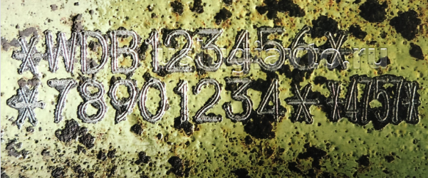 Наш пример лишь демонстрирует глубину нанесения маркировки и то, что VIN-код наносится в одну строку. Маркировка, которая на фото, нанесена на толстый металл пандуса для заезда автомобиля. Ни один автомобиль от ошибок нанесения пока что не пострадал :) Мы готовы наносить маркировку не только на тонкий металл несущего кузова, но и на рамы джипов и грузовиков. Тиснение достаточное для выполнения требований регламента по ее долговечности + место нанесения покрывается защитным составом.