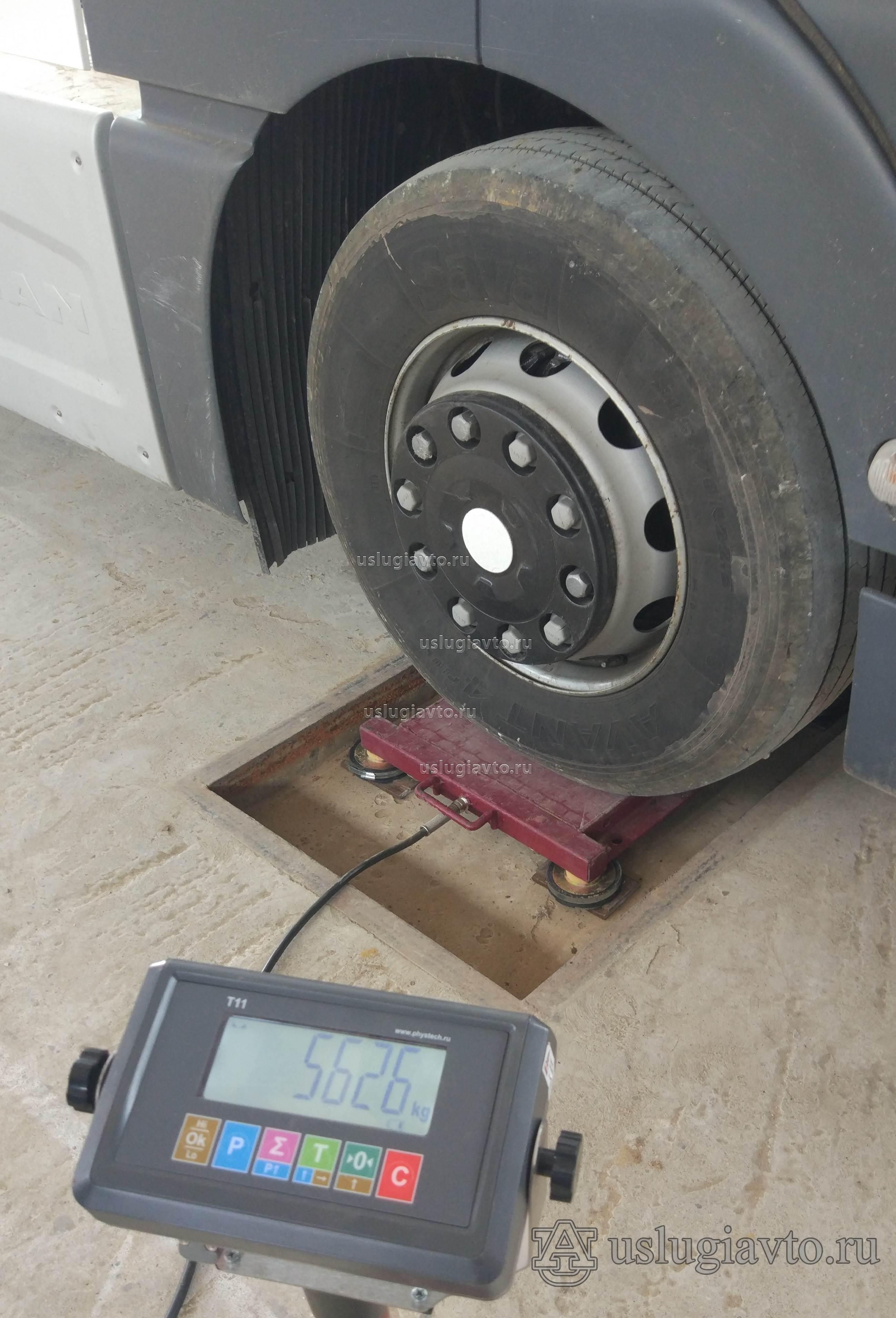 На фото грузовой автомобиль в процессе поосного взвешивания и определения габаритных размеров. Методика взвешивание предусматривает троекратный заезд каждой оси на весы, а это минут 40 на весь процесс. Плюс минут 30 на измерение габаритов.
