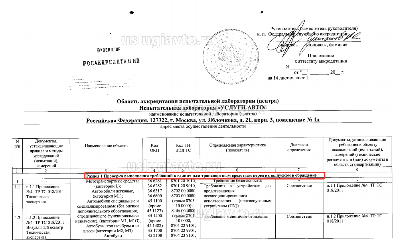 ИЛ УСЛУГИ-АВТО аккредитована на оценку соответствия единичных ТС (Область аккредитации: раздел 1. Проверка выполнения требований к единичным транспортным средствам перед их выпуском в обращение)