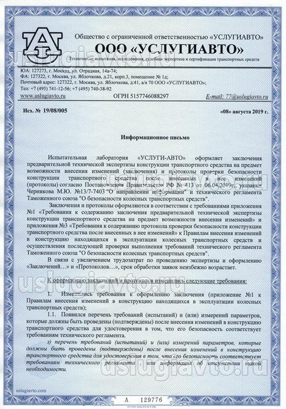 Испытательная лаборатория «УСЛУГИ-АВТО» оформляет заключения предварительной технической экспертизы конструкции транспортного средства на предмет возможности внесения изменений (заключения) и протоколы проверки безопасности конструкции транспортного средства после внесенных в нее изменений (протоколы) согласно Постановления Правительства РФ № 413 от 06.04.2019г., указания Черникова М.Ю. №13/7-7403 "О направлении информации" и технического регламента Таможенного союза "О безопасности колесных транспортных средств".