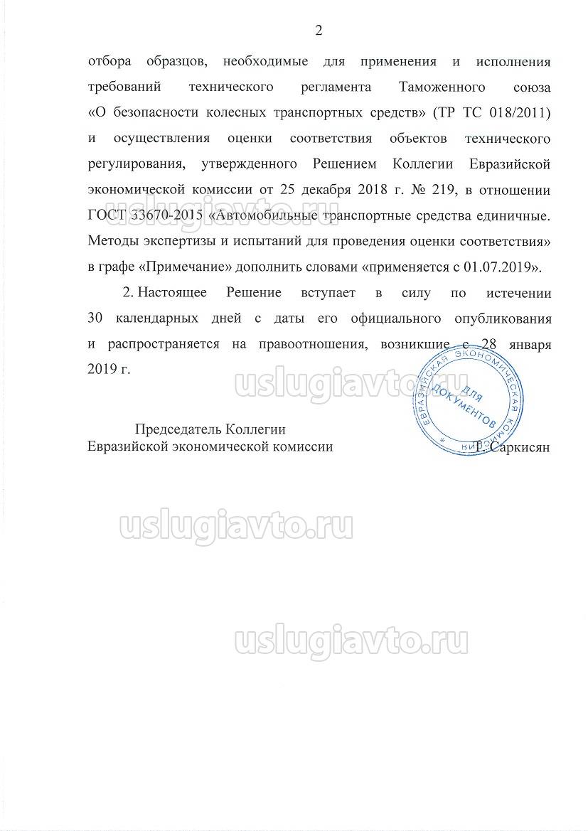 1. Пункты 1, 18 и 65 перечня международных и региональных (межгосударственных) стандартов, а в случае их отсутствия – национальных (государственных) стандартов, содержащих правила и методы исследований (испытаний) и измерений, в том числе правила отбора образцов, необходимые для применения и исполнения требований технического регламента Таможенного союза «О безопасности колесных транспортных средств» (ТР ТС 018/2011) и осуществления оценки соответствия объектов технического регулирования, утвержденного Решением Коллегии Евразийской экономической комиссии от 25 декабря 2018 г. № 219, в отношении ГОСТ 33670-2015 «Автомобильные транспортные средства единичные. Методы экспертизы и испытаний для проведения оценки соответствия» в графе «Примечание» дополнить словами «применяется с 01.07.2019».