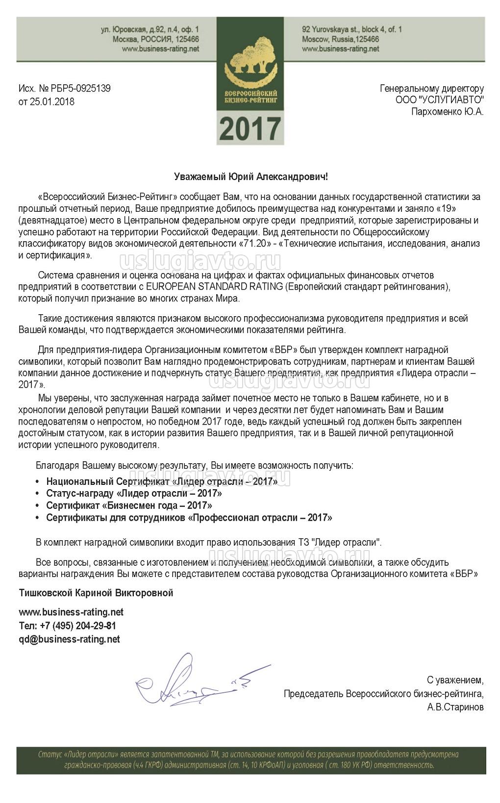 Согласно письму Всероссийского бизнес рейтинга компания ООО "УСЛУГИАВТО" (ИНН 9715229645) по данным РОССТАТа вошла в число лучших по виду деятельности и представлена к национальной номинацации "Лидер отрасли 2017".