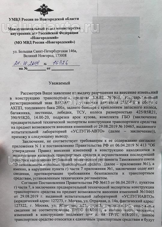 Согласно Постановлению Правительства РФ № 413 от 06.04.2019г., п. 7 (г) (НЕРАЗБОРЧИВО) в заключении Предв. Тех. Экспертизы № 10465 от 29.08.2019г. выданной ИЛ «Услуги Авто» (РФ г. Москва, ул. Яблочкова д. 21, корп. 3, пом. № 1д) содержутся сведения не соотв. ТР ТС 018/2011, а именно часть вносимых изменений в конструкцию подпадает под п. 68 ТР/ТС 018/2011, а именно относятся к единичным транспортным средствам и будут являться индивидуальным творчеством и не подпадает под определение “внесение из-ий в конструкцию Т/С”. Также предоставленное Т/С не соответствует рег.док-ам / а именно № дви-ля не соотв. ПТС и отсутств. Док-ты на новый сил. Агрегат, так же кол-во п/м не соотв. ПТС”.