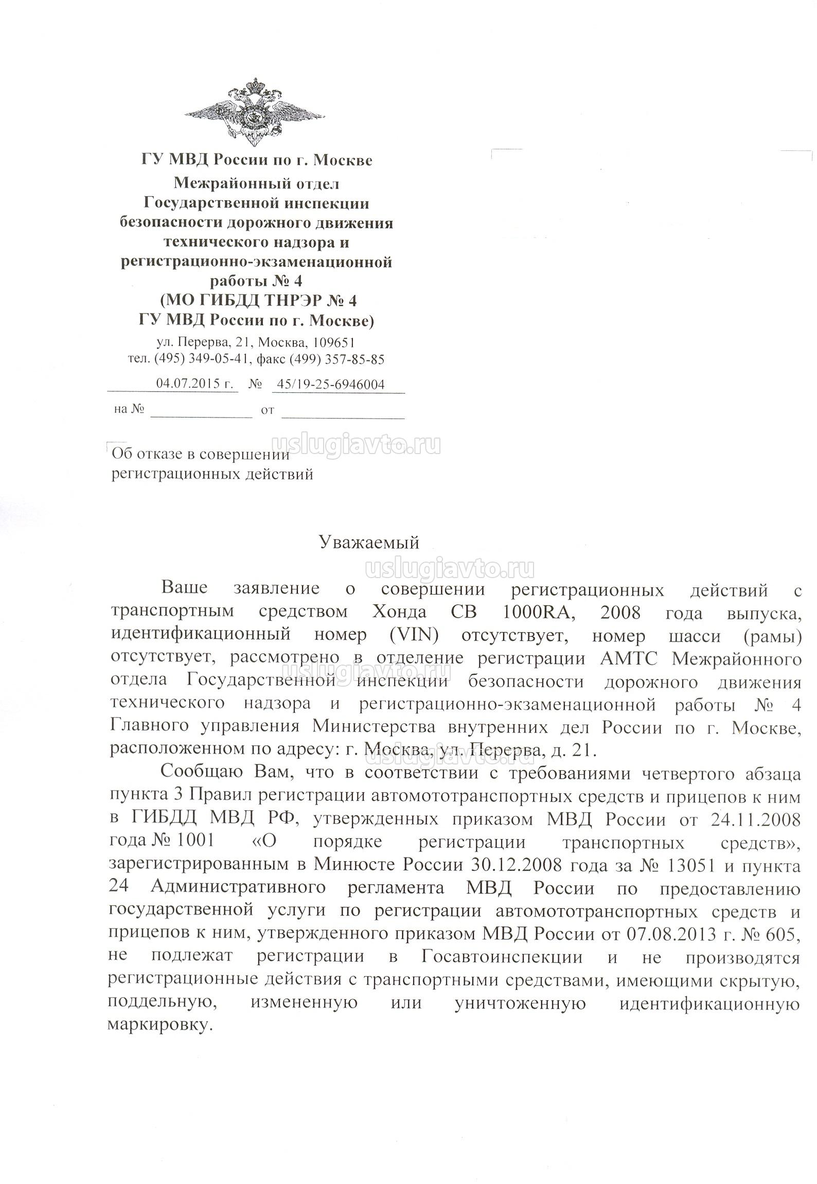 Гражданин пояснил, что он, посредством своего представителя по доверенности обратился в МРЭО, чтобы перерегистрировать мотоцикл на свое имя, однако в совершении регистрационных действий ему было отказано со ссылкой на то, что учет на раме мотоцикла уничтожена заводская маркировка.