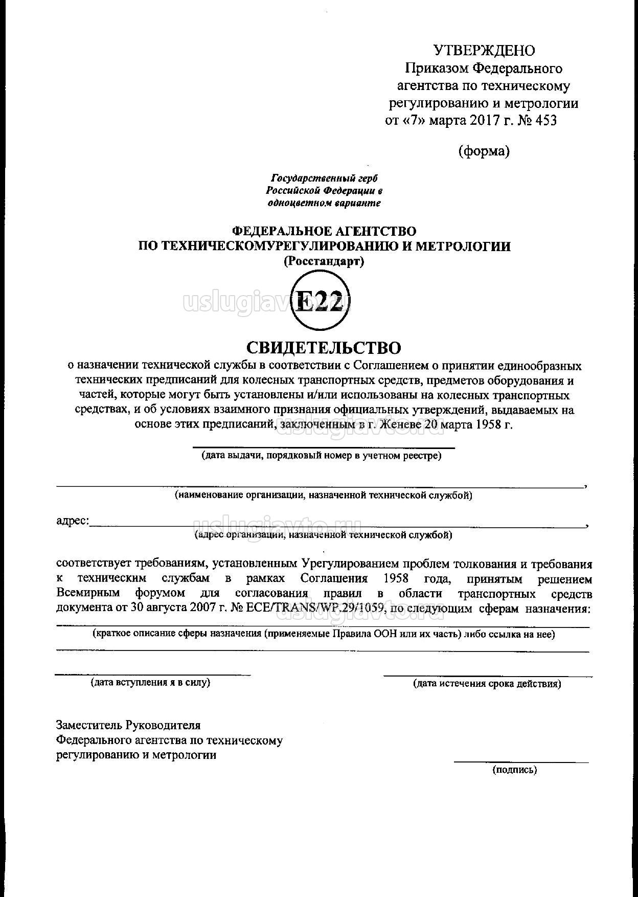 3. Утвердить прилагаемую форму свидетельства о назначении технической службы в соответствии с Соглашением о принятии единообразных технических предписаний для колесных транспортных средств, предметов оборудования и частей, которые могут быть установлены и/или использованы на колесных транспортных средствах, и об условиях взаимного признания официальных утверждений, выдаваемых на основе этих предписаний, заключенным в г. Женеве 20 марта 1958 г.
