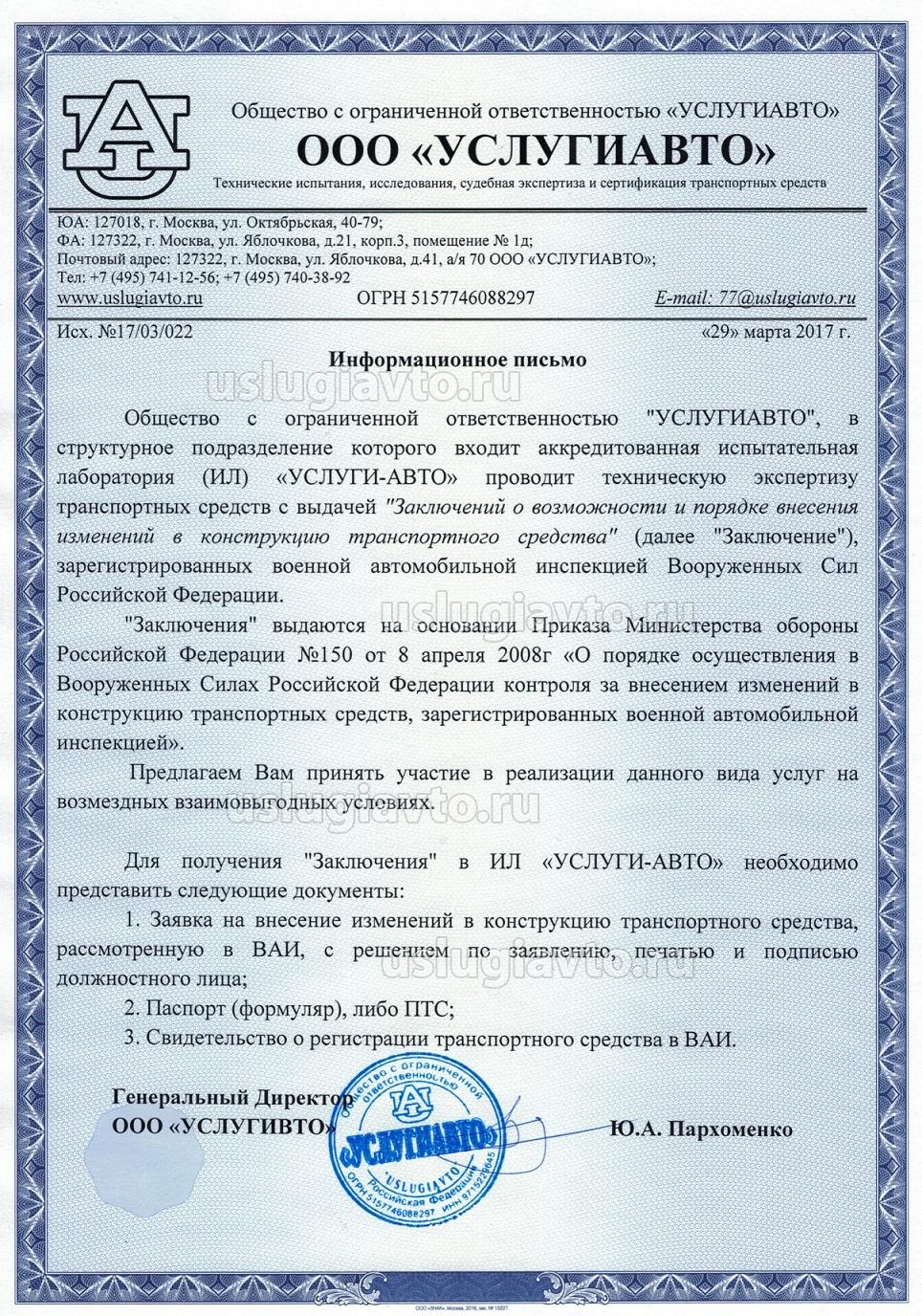 Общество с ограниченной ответственностью "УСЛУГИАВТО", в структурное подразделение которого входит аккредитованная испытательная лаборатория (ИЛ) «УСЛУГИ-АВТО» является одним из исполнителей Государственного контракта от «08»декабря 2017г. № 654/ЭА/2017/ДГЗ/З на оказание услуг по проведению технической экспертизы и выдаче "Заключений о возможности и порядке внесения изменений в конструкцию транспортного средства" (далее «Заключение») для нужд Министерства обороны Российской Федерации в 2018 году и проводит техническую экспертизу с выдачей «Заключений» для транспортных средств, зарегистрированных военной автомобильной инспекцией Вооруженных Сил Российской Федерации.