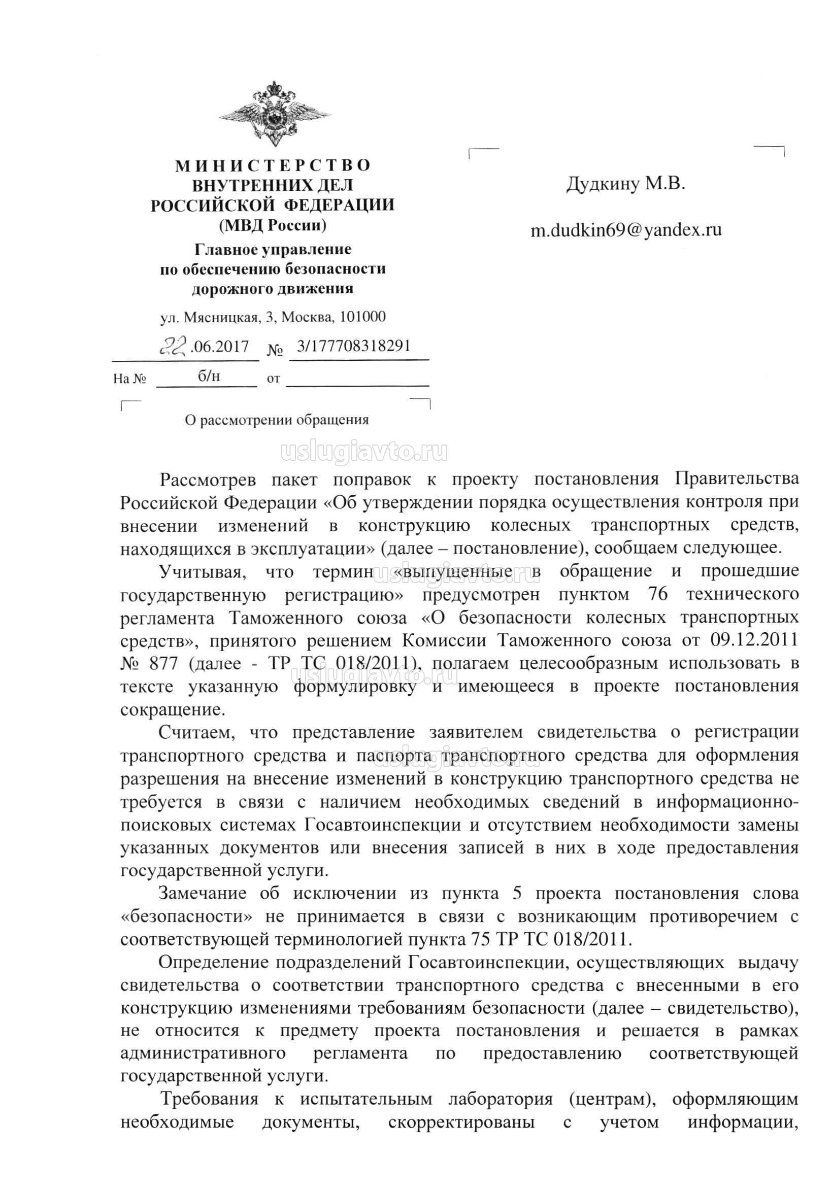 2.В подпункте 1 пункта 6 сводки предложений участником публичного обсуждения указано, что пункт 3 Порядка содержит положение о том, что подразделение органа внутренних дел не только выдает свидетельство о соответствии транспортного средства с внесенными в его конструкцию изменениями требованиям безопасности, но и оформляет разрешение на внесение изменений в конструкцию транспортного средства, в связи с чем пункт 2 проекта акта необходимо дополнить положением об утверждении административного регламента по оформлению разрешения на внесение изменений в конструкцию транспортного средства.