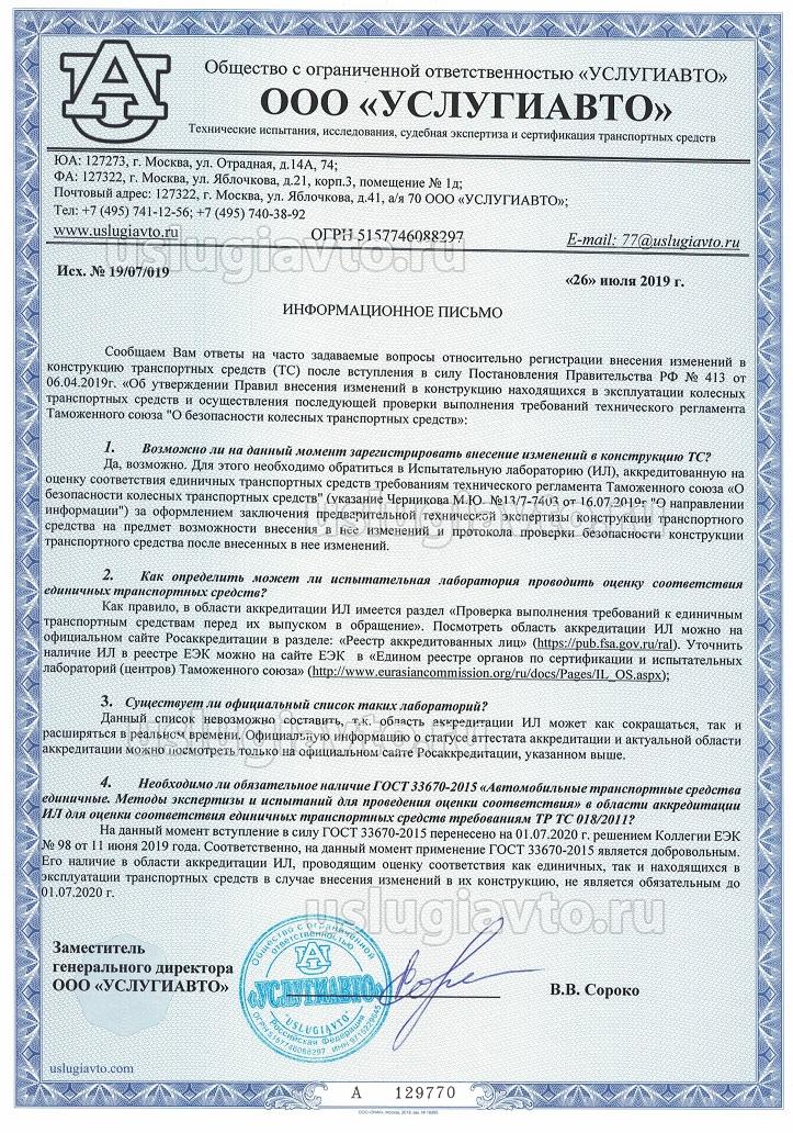 Информационное письмо относительно установки «внешних световых приборов для обеспечения освещенности рабочих органов и рабочей зоны» на транспортных средствах