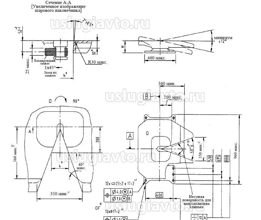 Минимальные углы отклонения опорно-сцепного устройства В случае зацепленного шкворня опорно-сцепного устройства, не