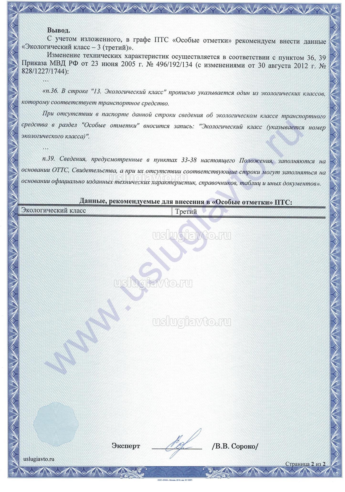 Заключение с целью определения экологического класса двигателя для внесения сведений в ПТС