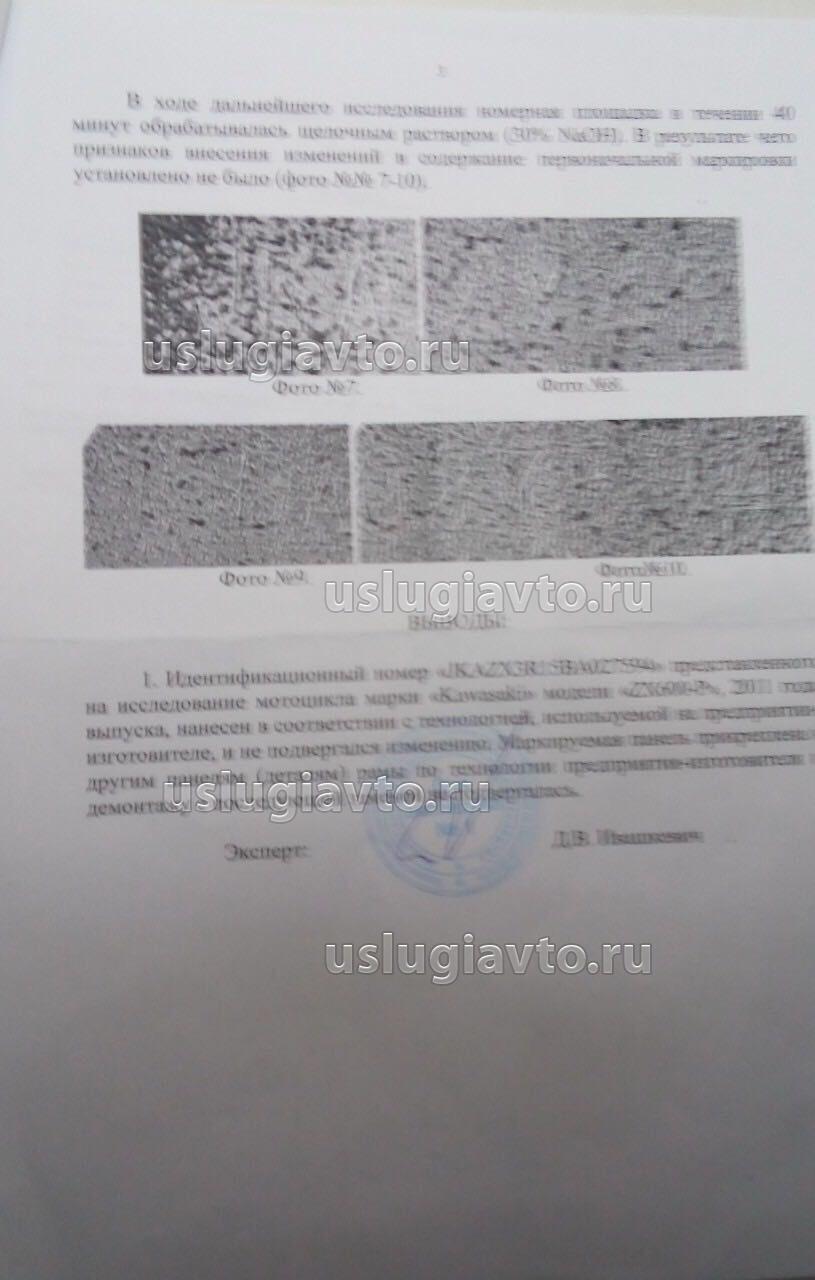 Есть еще такой момент. Данный мотоцикл подвергался экспертизе ВИН номера рамы еще в Белоруссии у прошлого владельца. Об этой экспертизе есть отметка в разрезанном белорусском ПТС. Однако результатов данной экспертизы у меня на руках нет, продавец скинул лишь фото акта в довольно плохом качестве, но читаемо. А оригиналы он отдал в белорусское ГАИ при снятии мотоцикла с учета. Проблема в том, что при проведении данной экспертизы, на сколько я понял, ВИН поливали какой-то кислотой. После данной процедуры половина ВИН номера практически не читается, разглядеть очень тяжело. Я предполагаю, что при получении ПТС с этим возникнут проблемы. Можете подсказать, как быть в такой ситуации? Необходимо проведение теперь уже повторной экспертизы? Можно ли сделать такую у Вас, каким образом она проводится, и что для этого необходимо?