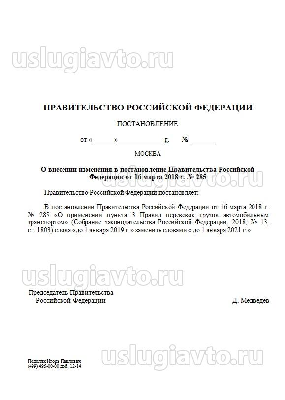 В постановлении Правительства Российской Федерации от 16 марта 2018 г. N 285 "О применении положений пункта 3 Правил перевозок грузов автомобильным транспортом" (Собрание законодательства Российской Федерации, 2018, N 13, ст. 1803) слова "до 1 января 2019 г." заменить словами "до 1 января 2021 г.".