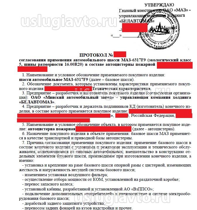 - Протокол согласования применения шасси, утверждённый изготовителем шасси;