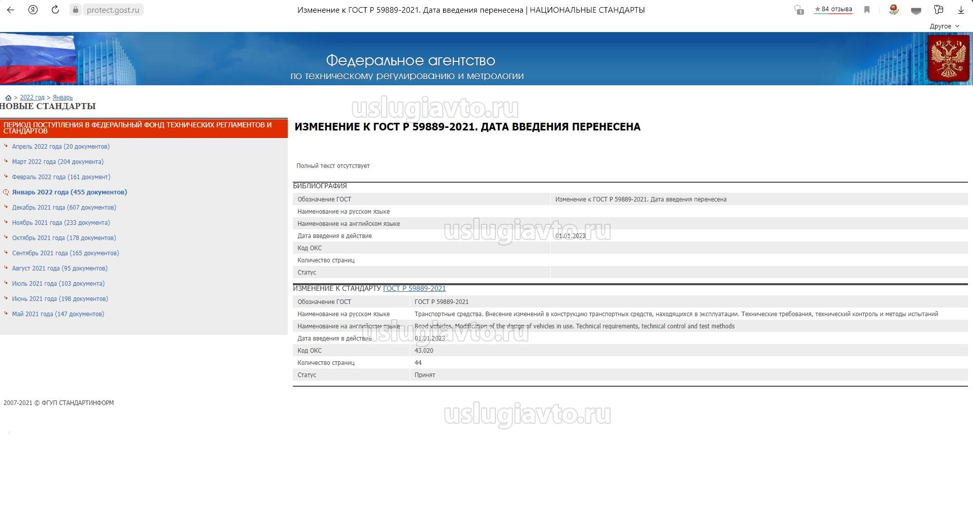Приказом Росстандарта от 25.11.2021 N 1603-ст "Об утверждении национального стандарта Российской Федерации" был утвержден ГОСТ Р 59889-2021 "Транспортные средства. Внесение изменений в конструкцию транспортных средств, находящихся в эксплуатации. Технические требования, технический контроль и методы испытаний" с датой введения в действие 1 апреля 2022 г.