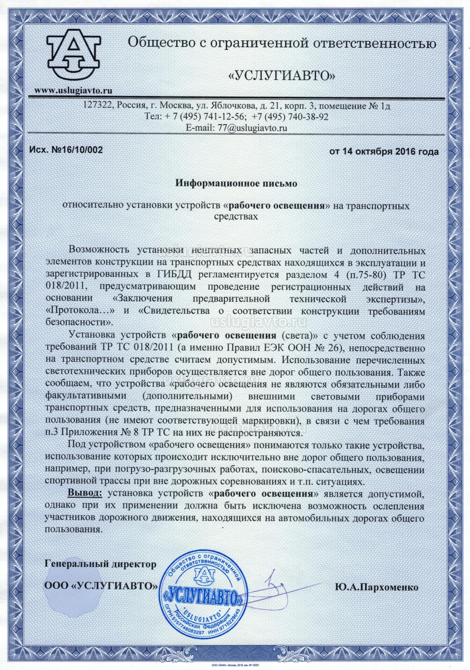 Установку устройств «рабочего освещения (света)» с учетом соблюдения требований ТР ТС 018/2011 (а именно Правил ЕЭК ООН № 26), непосредственно на транспортном средстве считаем допустимым. Использование перечисленных светотехнических приборов осуществляется вне дорог общего пользования. Также сообщаем, что устройства «рабочего освещения не являются обязательными либо факультативными (дополнительными) внешними световыми приборами транспортных средств, предназначенными для использования на дорогах общего пользования (не имеют соответствующей маркировки), в связи с чем требования п.3 Приложения № 8 ТР ТС на них не распространяются.