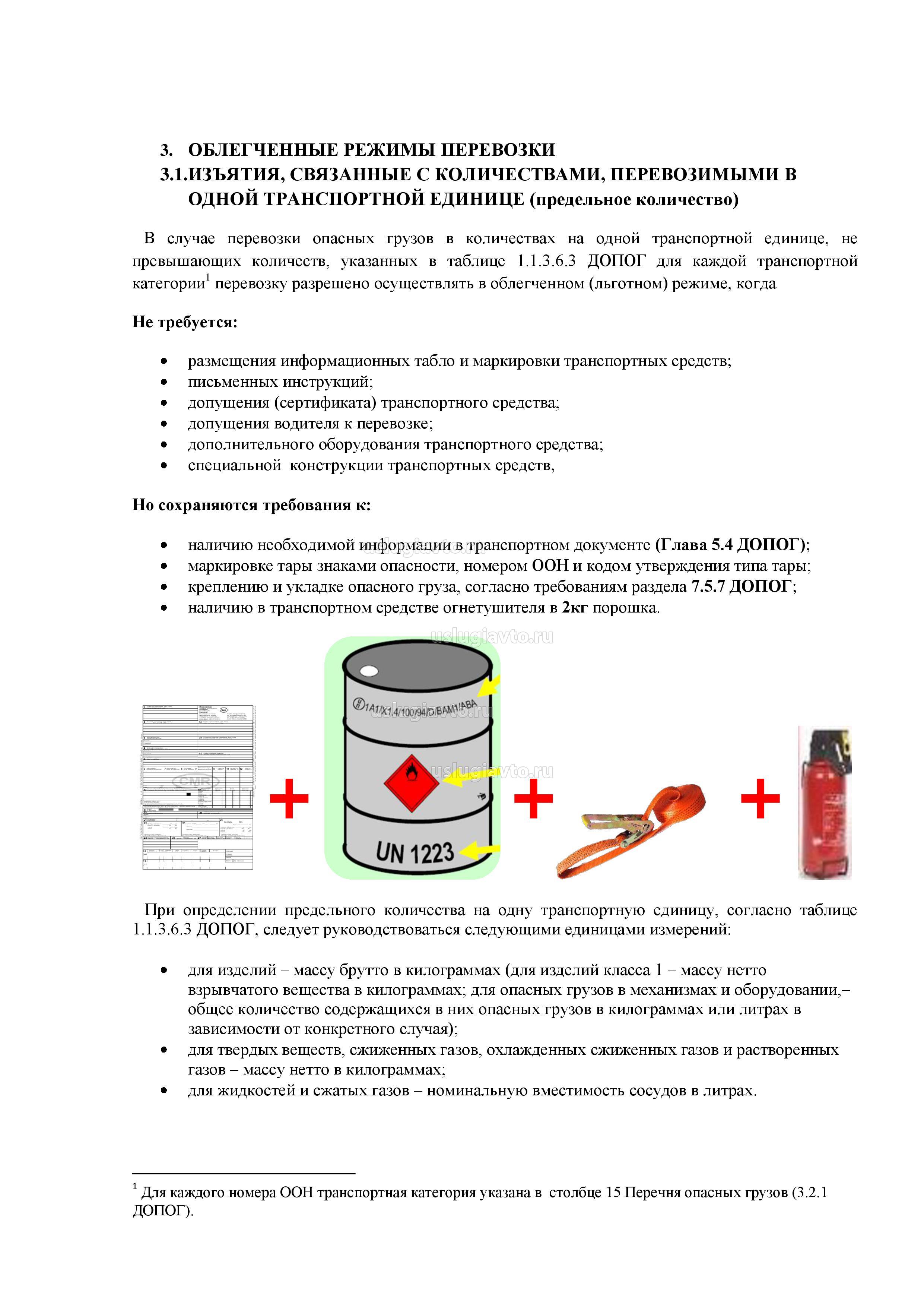 Дополнительным оборудованием транспортного средства являются также огнетушители. Огнетушители должны быть пригодны для тушения пожаров классов А, В и С.При перевозках в параметрах предельного количества (1.1.3.6 ДОПОГ) транспортное средство оборудуется одним огнетушителем емкостью в 2 кг порошка. При превышении величин, указанных в разделе 1.1.3.6 ДОПОГ емкость огнетушителя зависит от полной массы транспортного средства: