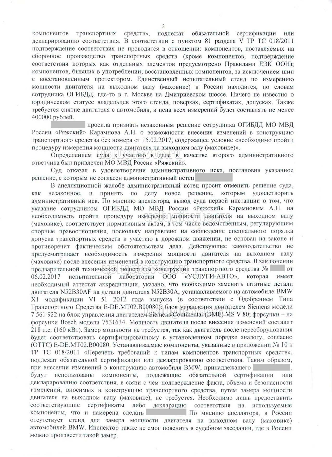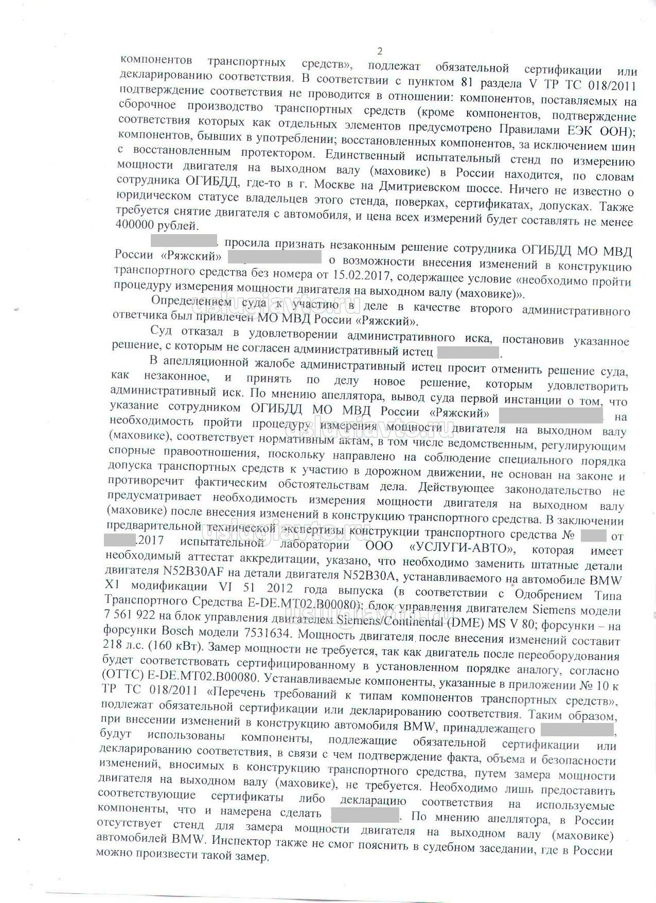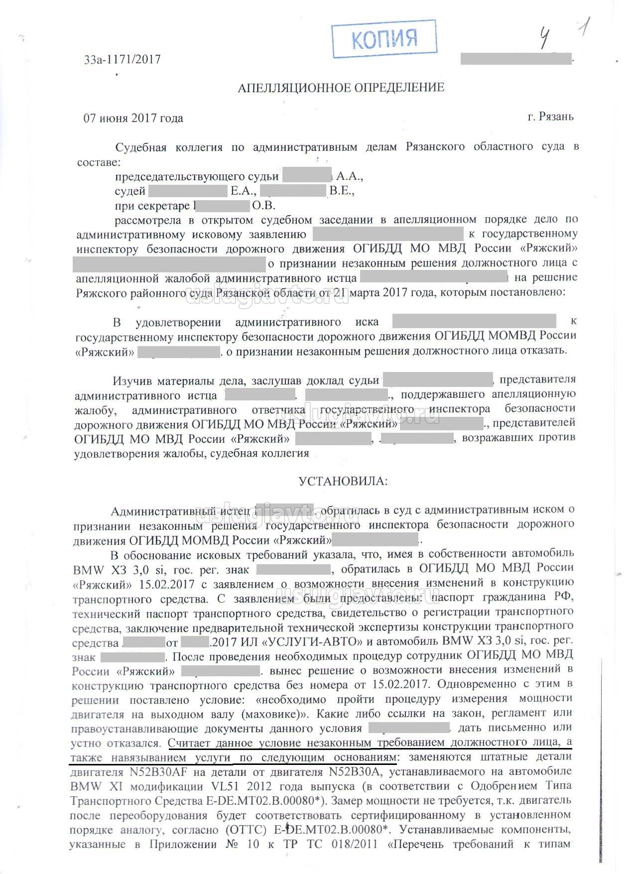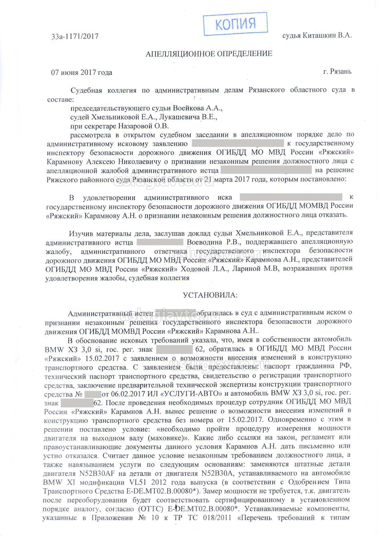 Административный истец ХХХ ХХ ХХ обратилась в суд с административным иском о признании незаконным решения государственного инспектора безопасности дорожного движения ОГИБДД МОМВД России «Ряжский» Карамнова А.Н.. В обоснование исковых требований указала, что, имея в собственности автомобиль BMW Х3 3,0 si, гос. peг. знак Х ХХХ ХХ 62, обратилась в ОГИБДД МО МВД России «Ряжский» 15.02.2017 с заявлением о возможности внесения изменений в конструкцию транспортного средства. С заявлением были предоставлены: паспорт гражданина РФ, технический паспорт транспортного средства, свидетельство о регистрации транспортного средства, заключение предварительной технической экспертизы конструкции транспортного средства № ХХХХ от 06.02.2017 ИЛ «УСЛУГИ-АВТО» и автомобиль BMW ХЗ 3,0 si, гос. peг. знак Х ХХХ ХХ 62. После проведения необходимых процедур сотрудник ОГИБДД МО МВД России «Ряжский» Карамнов А.Н. вынес решение о возможности внесения изменений в конструкцию транспортного средства без номера от 15.02.2017. Одновременно с этим в решении поставлено условие: «необходимо пройти процедуру измерения мощности двигателя на выходном валу (маховике)». Какие либо ссылки на закон, регламент или правоустанавливающие документы данного условия Карамнов А.Н. дать письменно или устно отказался. Считает данное условие незаконным требованием должностного лица, а также навязыванием услуги по следующим основаниям: заменяются штатные детали двигателя N52B30AF гга детали от двигателя N52B30A, устанавливаемого на автомобиле BMW XI модификации VL51 2012 года выпуска (в соответствии с Одобрением Типа Транспортного Средства E-DE.MT02.B.00080*). Замер мощности не требуется, т.к. двигатель после переоборудования будет соответствовать сертифицированному в установленном порядке аналогу, согласно (ОТТС) Е-DE.МТ02.В.00080*. Устанавливаемые компоненты, указанные в Приложении № 10 к ТР ТС 018/2011 «Перечень требований к типам компонентов транспортных средств», подлежат обязательной сертификации или декларированию соответствия. В соответствии с пунктом 81 раздела V ТР ТС 018/2011 подтверждение соответствия не проводится в отношении: компонентов, поставляемых на сборочное производство транспортных средств (кроме компонентов, подтверждение соответствия которых как отдельных элементов предусмотрено Правилами ЕЭК ООН); компонентов, бывших в употреблении; восстановленных компонентов, за исключением шин с восстановленным протектором. Единственный испытательный стенд по измерению мощности двигателя на выходном валу (маховике) в России находится, по словам сотрудника ОГИБДД, где-то в г. Москве на Дмитриевском шоссе. Ничего не известно о юридическом статусе владельцев этого стенда, поверках, сертификатах, допусках. Также требуется снятие двигателя с автомобиля, и цена всех измерений будет составлять не менее 400000 рублей. ХХХ ХХ ХХ просила признать незаконным решение сотрудника ОГИБДД МО МВД России «Ряжский» Карамнова А.Н. о возможности внесения изменений в конструкцию транспортного средства без номера от 15.02.2017, содержащее условие «необходимо пройти процедуру измерения мощности двигателя на выходном валу (маховике)». Определением суда к участию в деле в качестве второго административного ответчика был привлечен МО МВД России «Ряжский».Суд отказал в удовлетворении административного иска, постановив указанное решени