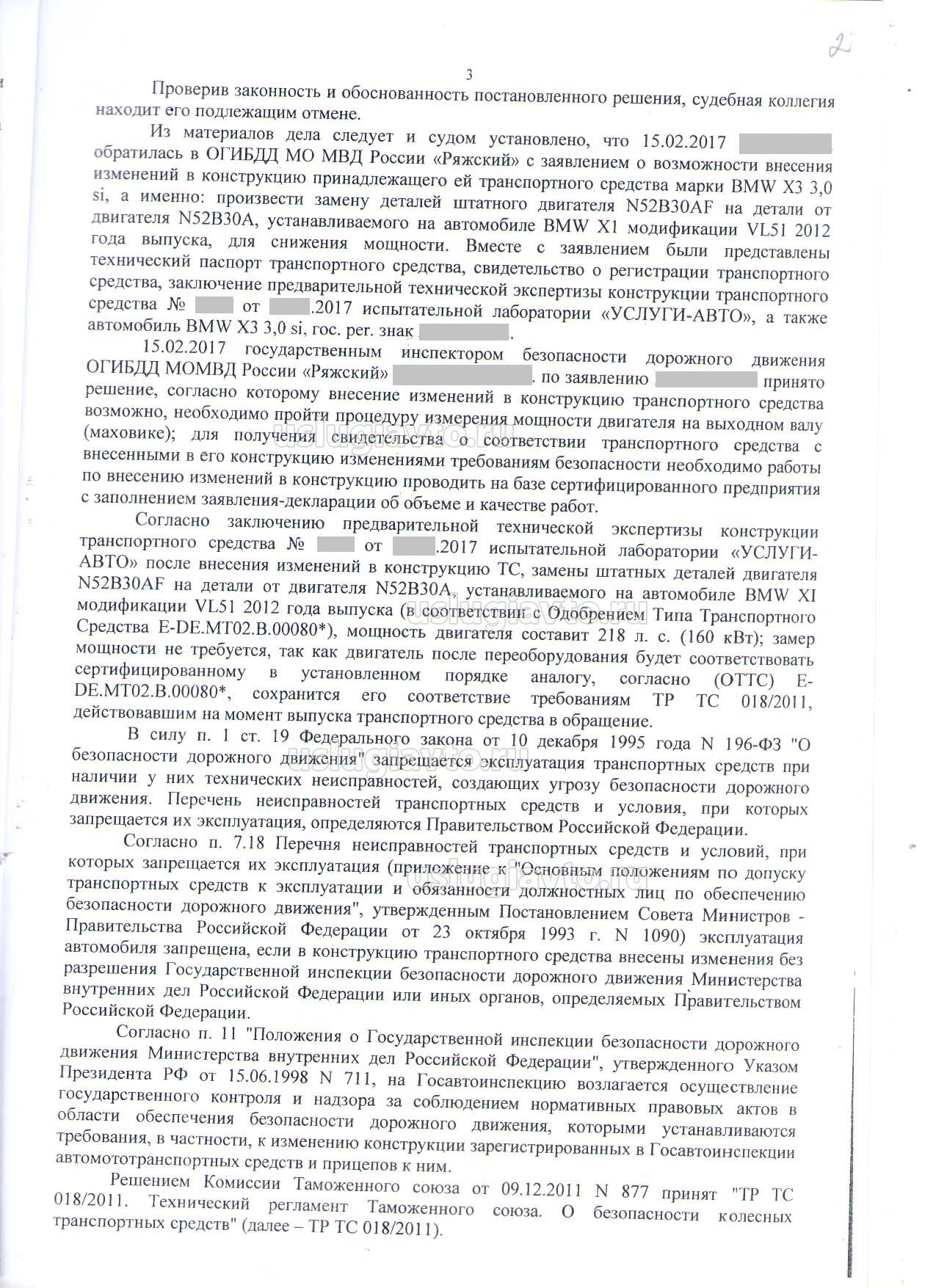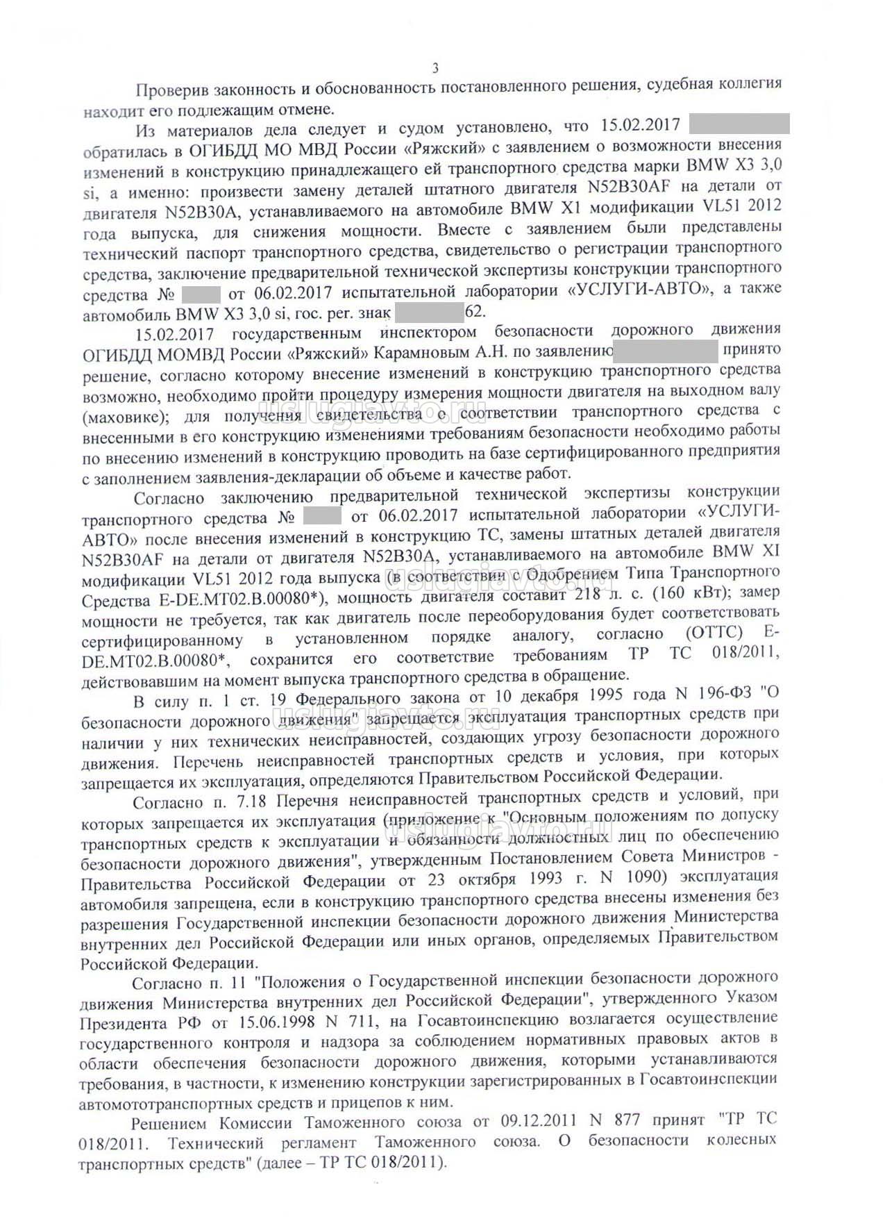 Из материалов дела следует и судом установлено, что 15.02.2017 ХХХ ХХ ХХ обратилась в ОГИБДД МО МВД России «Ряжский» с заявлением о возможности внесения изменений в конструкцию принадлежащего ей транспортного средства марки BMW ХЗ 3,0 si, а именно: произвести замену деталей штатного двигателя N52B30AF на детали от двигателя N52B30A, устанавливаемого на автомобиле BMW XI модификации VL51 2012 года выпуска, для снижения мощности. Вместе с заявлением были представлены технический паспорт транспортного средства, свидетельство о регистрации транспортного средства, заключение предварительной технической экспертизы конструкции транспортного средства № ХХХХ от 06.02.2017 испытательной лаборатории «УСЛУГИ-АВТО», а также автомобиль BMW ХЗ 3,0 si, гос. peг. знак Х ХХХ ХХ 62.15.02.2017 государственным инспектором безопасности дорожного движения ОГИБДД МОМВД России «Ряжский» Карамновым А.Н. по заявлению ХХХ ХХ ХХ принято решение, согласно которому внесение изменений в конструкцию транспортного средства возможно, необходимо пройти процедуру измерения мощности двигателя на выходном валу (маховике); для получения свидетельства о соответствии транспортного средства с внесенными в его конструкцию изменениями требованиям безопасности необходимо работы по внесению изменений в конструкцию проводить на базе сертифицированного предприятия с заполнением заявления-декларации об объеме и качестве работ.Согласно заключению предварительной технической экспертизы конструкции транспортного средства № ХХХХ от 06.02.2017 испытательной лаборатории «УСЛУГИ- АВТО» после внесения изменений в конструкцию ТС, замены штатных деталей двигателя N52B30AF на детали от двигателя N52B30A, устанавливаемого на автомобиле BMW XI модификации VL51 2012 года выпуска (в соответствии с Одобрением Типа Транспортного Средства E-DE.MT02.B.00080*), мощность двигателя составит 218 л. с. (160 кВт); замер мощности не требуется, так как двигатель после переоборудования будет соответствовать сертифицированному в установленном порядке аналогу, согласно (ОТТС) Е- DE.MT02.B.00080*, сохранится его соответствие требованиям ТР ТС 018/2011, действовавшим на момент выпуска транспортного средства в обращение.В силу п. 1 ст. 19 Федерального закона от 10 декабря 1995 года N 196-ФЗ "О безопасности дорожного движения" запрещается эксплуатация транспортных средств при наличии у них технических неисправностей, создающих угрозу безопасности дорожного движения. Перечень неисправностей транспортных средств и условия, при которых запрещается их эксплуатация, определяются Правительством Российской Федерации.Согласно п. 7.18 Перечня неисправностей транспортных средств и условий, при которых запрещается их эксплуатация (приложение к "Основным положениям по допуску транспортных средств к эксплуатации и обязанности должностных лиц по обеспечению безопасности дорожного движения", утвержденным Постановлением Совета Министров - Правительства Российской Федерации от 23 октября 1993 г. N 1090) эксплуатация автомобиля запрещена, если в конструкцию транспортного средства внесены изменения без разрешения Государственной инспекции безопасности дорожного движения Министерства внутренних дел Российской Федерации или иных органов, определяемых Правительством Российской Федерации.Согласно п. 11 "Положения о Государственной инспекции безопасности дорожного движения М
