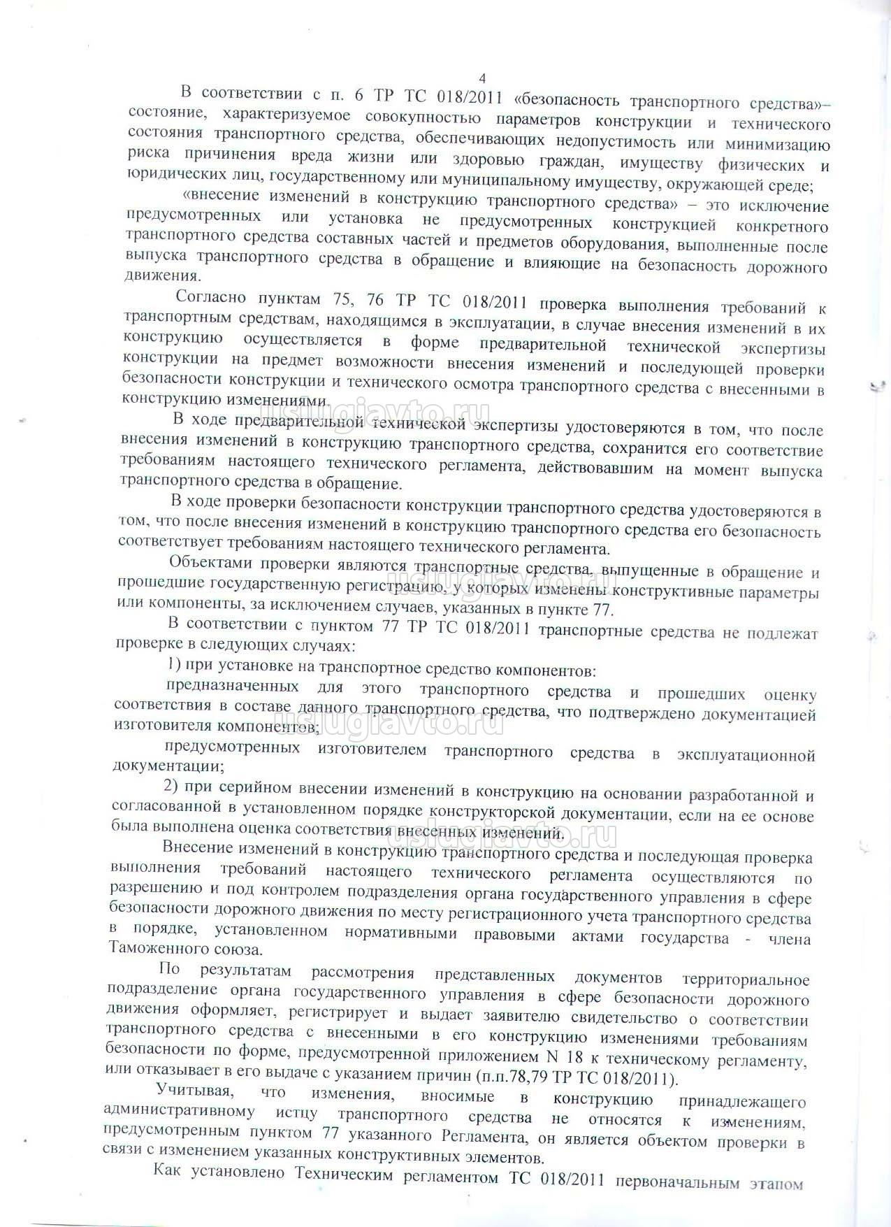 Замер мощности не требуется, т.к. двигатель после переоборудования будет соответствовать сертифицированному в установленном порядке аналогу, согласно (ОТТС) Е-DE.МТ02.В.00080*. Устанавливаемые компоненты, указанные в Приложении № 10 к ТР ТС 018/2011 «Перечень требований к типам компонентов транспортных средств», подлежат обязательной сертификации или декларированию соответствия. В соответствии с пунктом 81 раздела V ТР ТС 018/2011 подтверждение соответствия не проводится в отношении: компонентов, поставляемых на сборочное производство транспортных средств (кроме компонентов, подтверждение соответствия которых как отдельных элементов предусмотрено Правилами ЕЭК ООН); компонентов, бывших в употреблении; восстановленных компонентов, за исключением шин с восстановленным протектором. Единственный испытательный стенд по измерению мощности двигателя на выходном валу (маховике) в России находится, по словам сотрудника ОГИБДД, где-то в г. Москве на Дмитриевском шоссе. Ничего не известно о юридическом статусе владельцев этого стенда, поверках, сертификатах, допусках. Также требуется снятие двигателя с автомобиля, и цена всех измерений будет составлять не менее 400000 рублей. ХХХ ХХ ХХ просила признать незаконным решение сотрудника ОГИБДД МО МВД России «Ряжский» Карамнова А.Н. о возможности внесения изменений в конструкцию транспортного средства без номера от 15.02.2017, содержащее условие «необходимо пройти процедуру измерения мощности двигателя на выходном валу (маховике)».