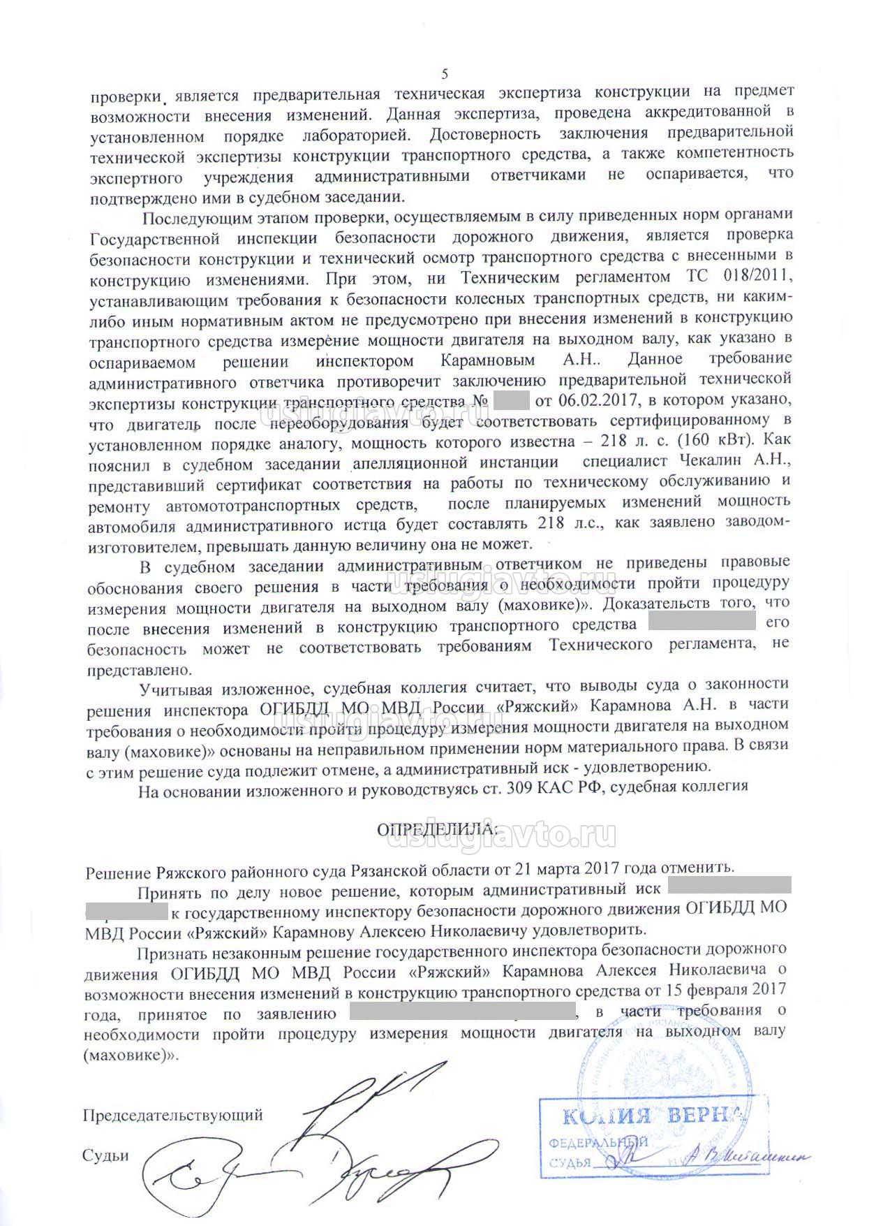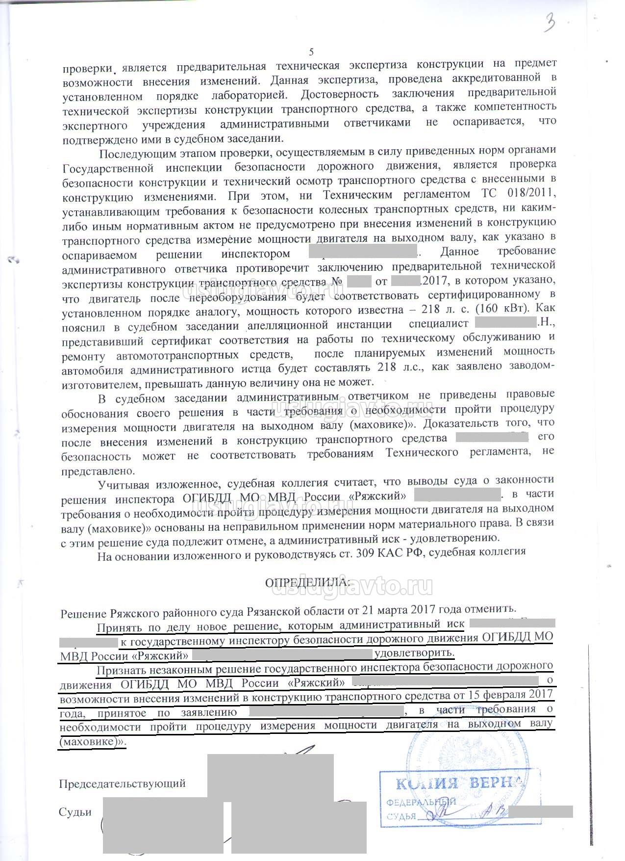 Положительное АППЕЛЯЦИОННОЕ ОПРЕДЕЛЕНИЕ от 7 июня 2017 г. - г. Рязань, относительно возможности изменения конструкции двигателя по аналогии с другой модификацией меньшей мощности.