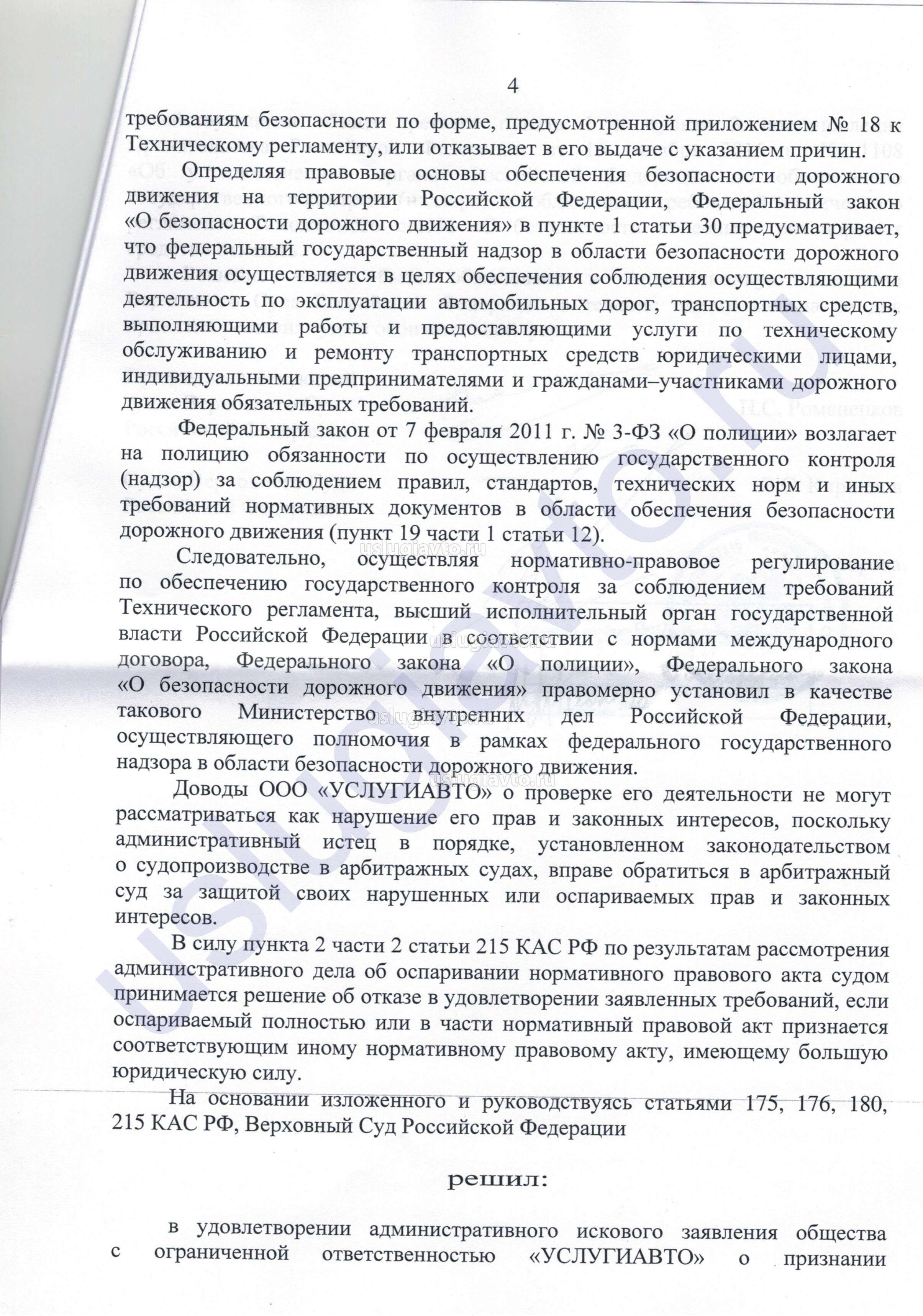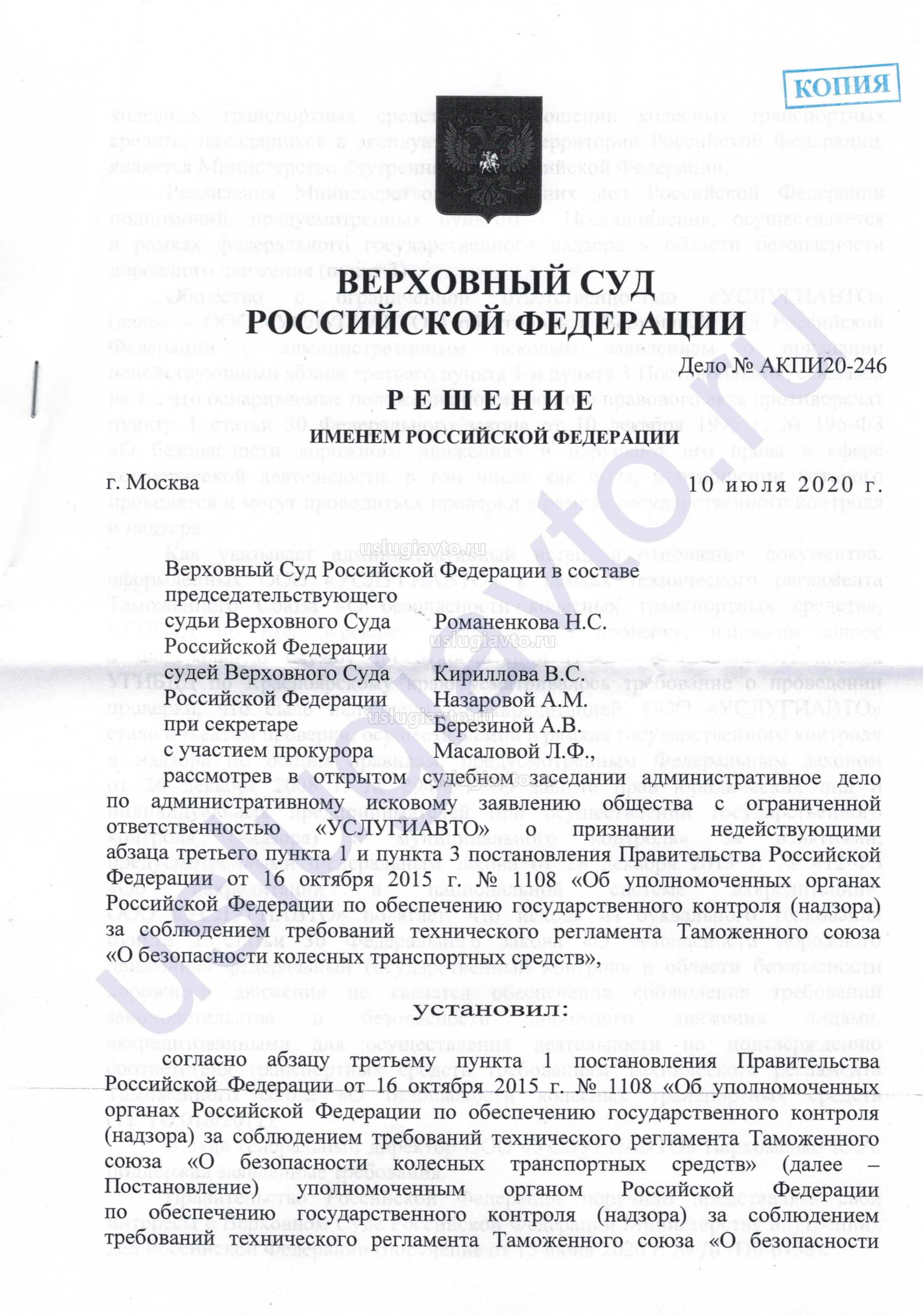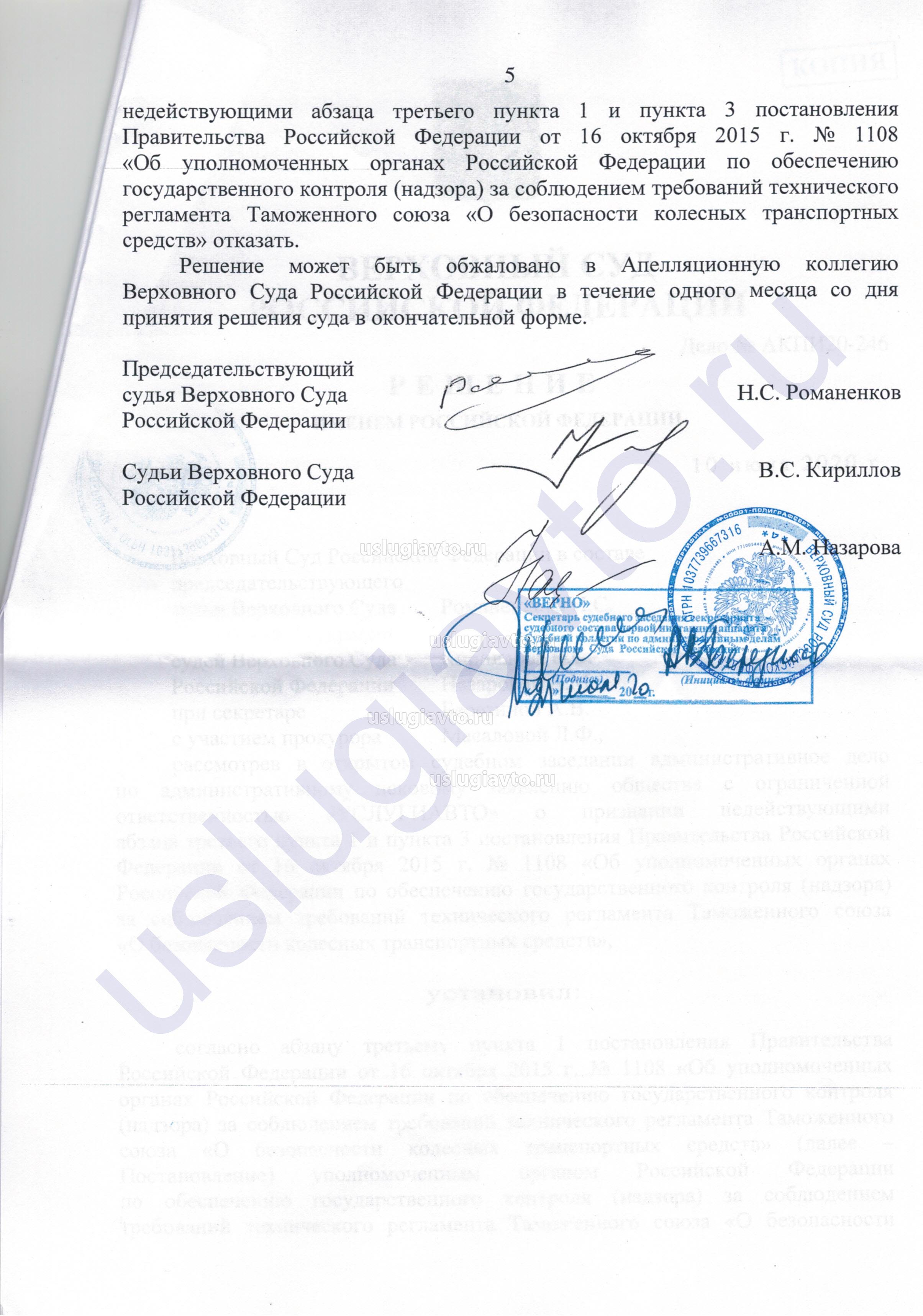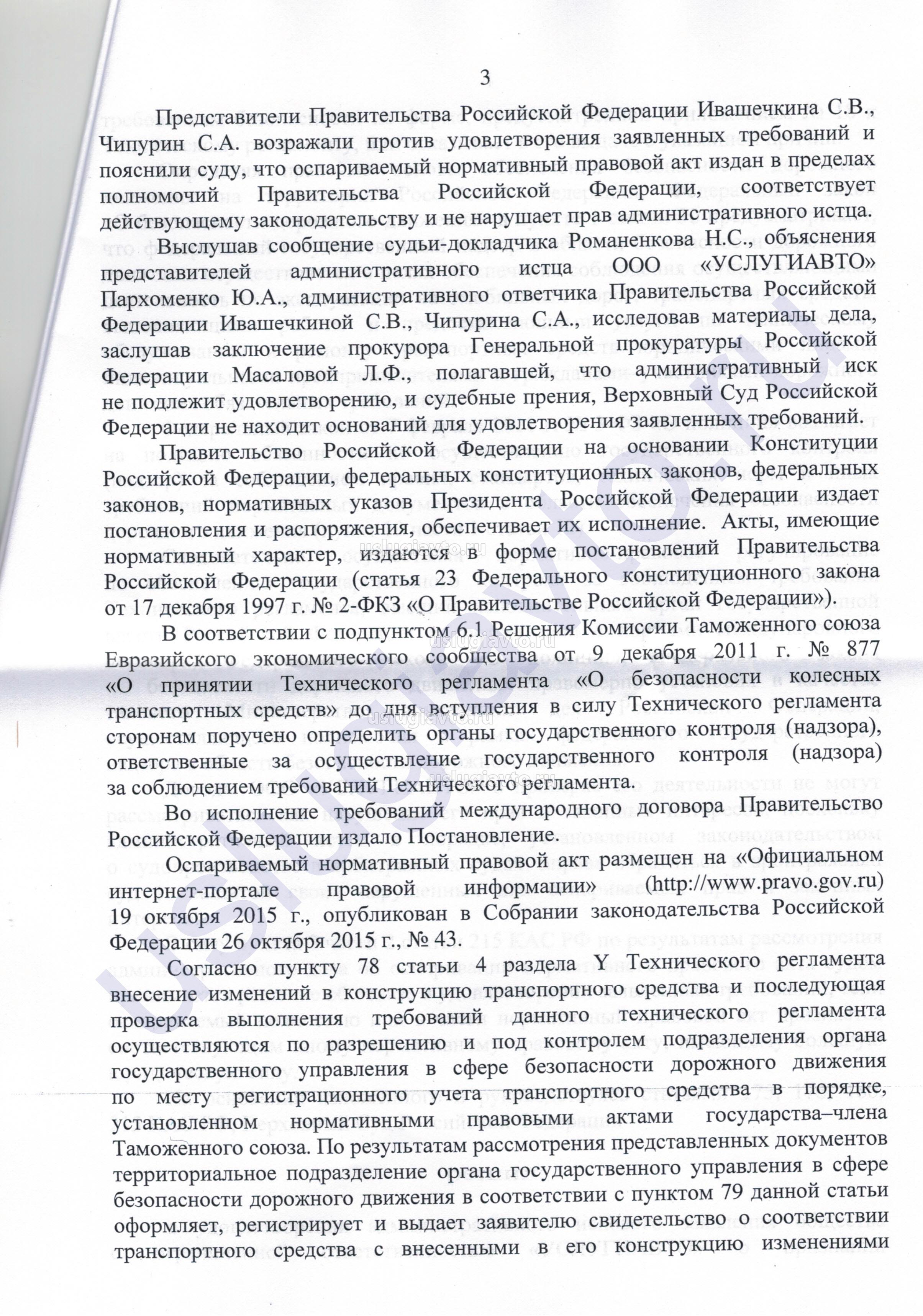 В судебном решении суд указал, что органы (Росстандарт и МВД), указанные в оспариваемом постановлении правительства № 1108, обладают исключительной компетенцией по надзору и контролю за соблюдением требований технического регламента «О безопасности колесных транспортных средств» (ТР ТС 018/2011).