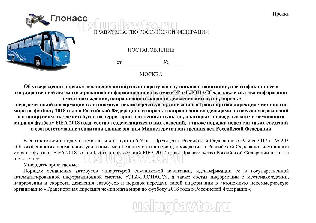 Настоящий Порядок разработан в соответствии с подпунктом «а» пункта 6 Указа Президента Российской Федерации от 9 мая 2017 г. № 202 «Об особенностях применения усиленных мер безопасности в период проведения в Российской Федерации чемпионата мира по футболу FIFA 2018 года и Кубка конфедераций FIFA 2017 года» и устанавливает правила оснащения автобусов аппаратурой спутниковой навигации, идентификации ее в государственной автоматизированной информационной системе «ЭРА-ГЛОНАСС», а также состав информации о местонахождении, направлении и скорости движения автобусов и порядок передачи такой информации в автономную некоммерческую организацию «Транспортная дирекция чемпионата мира по футболу 2018 года в Российской Федерации».