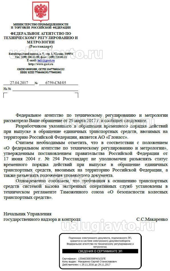 2) Если Росстандарт участвовал в подготовке, и АО ГЛОНАСС цитировал официальный документ, который равноправен ТР ТС 018/2011 (поскольку именно ТР ТС 018/2011 устанавливает требования по выпуску в обращение единичных ТС с аппаратурой ЭРА ГЛОНАСС), то прошу сообщить реквизиты документа и каким госорганом он выпущен.
