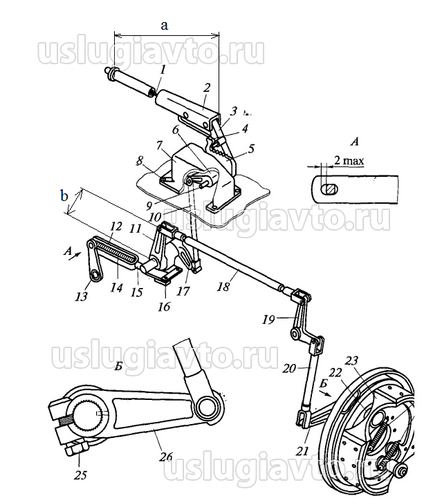 1.3. Привод стояночной тормозной системыТип - механический, рычажно-тросовый, воздействует на вспомогательные тормоза задних колес АТС;