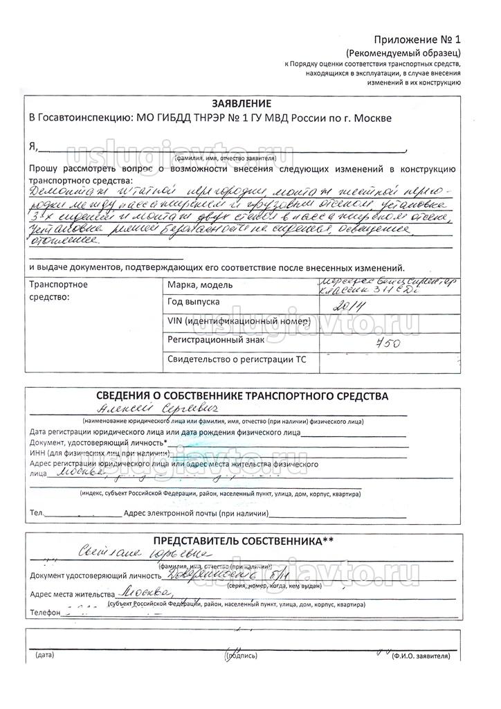 - Заявление в Госавтоинспекцию о возможности внесения изменений в конструкцию транспортного средства (форма по письму ГУ ОБДД от 25.02.2015 г. № 13/5-у-1225):