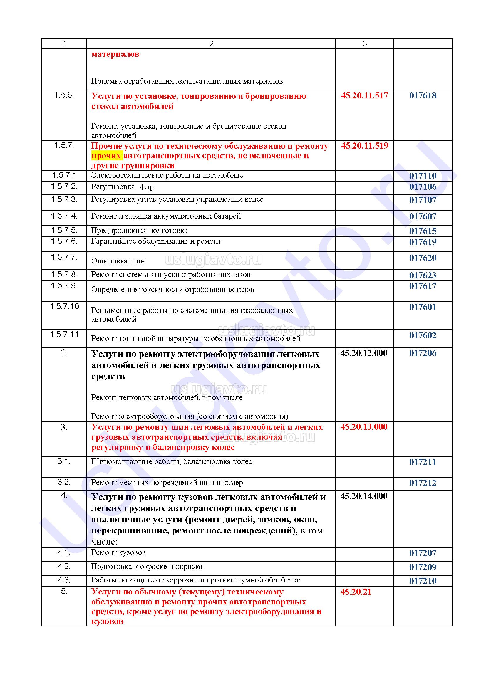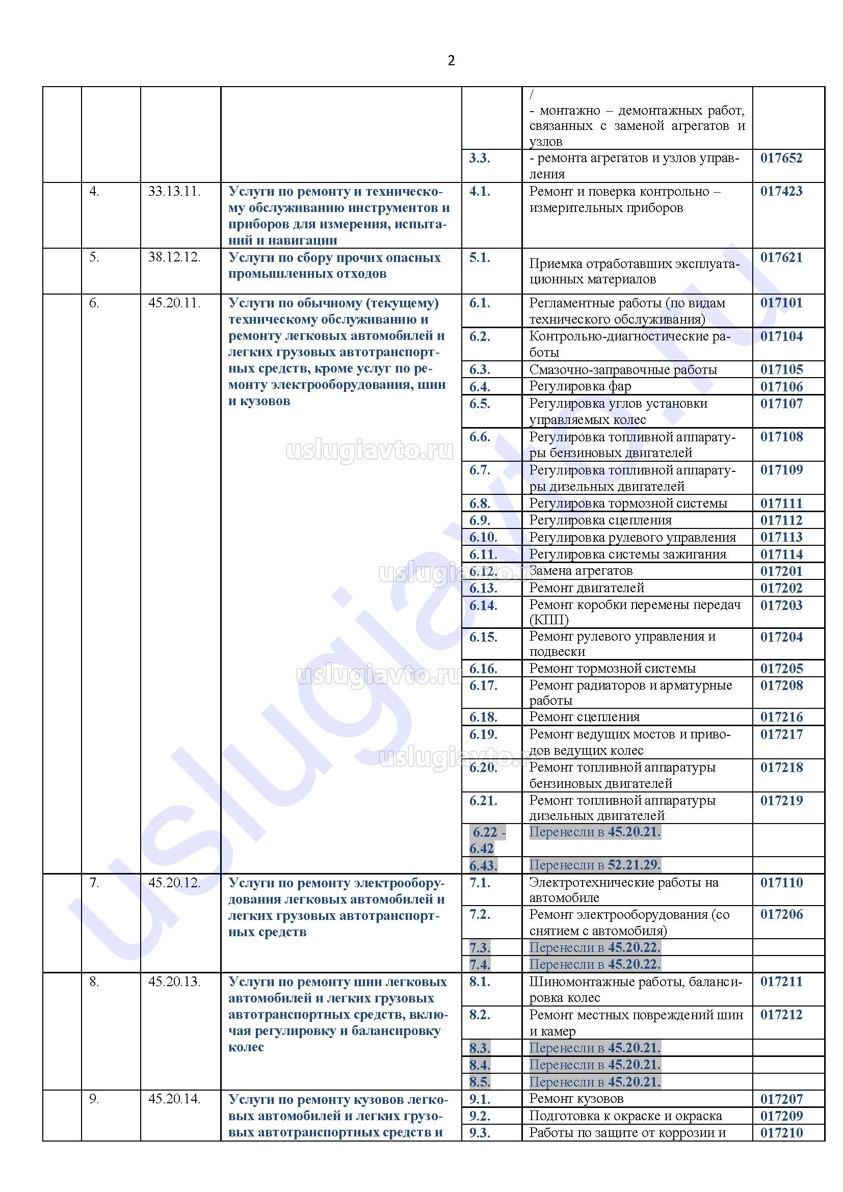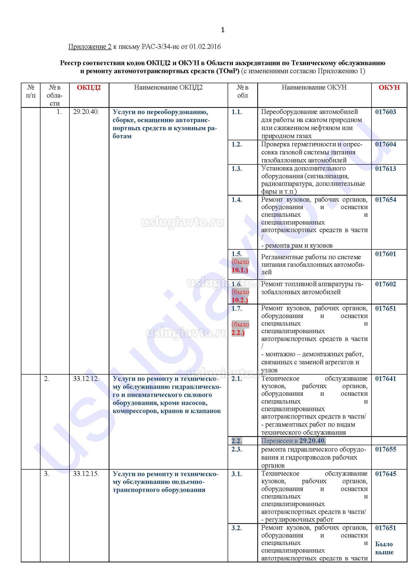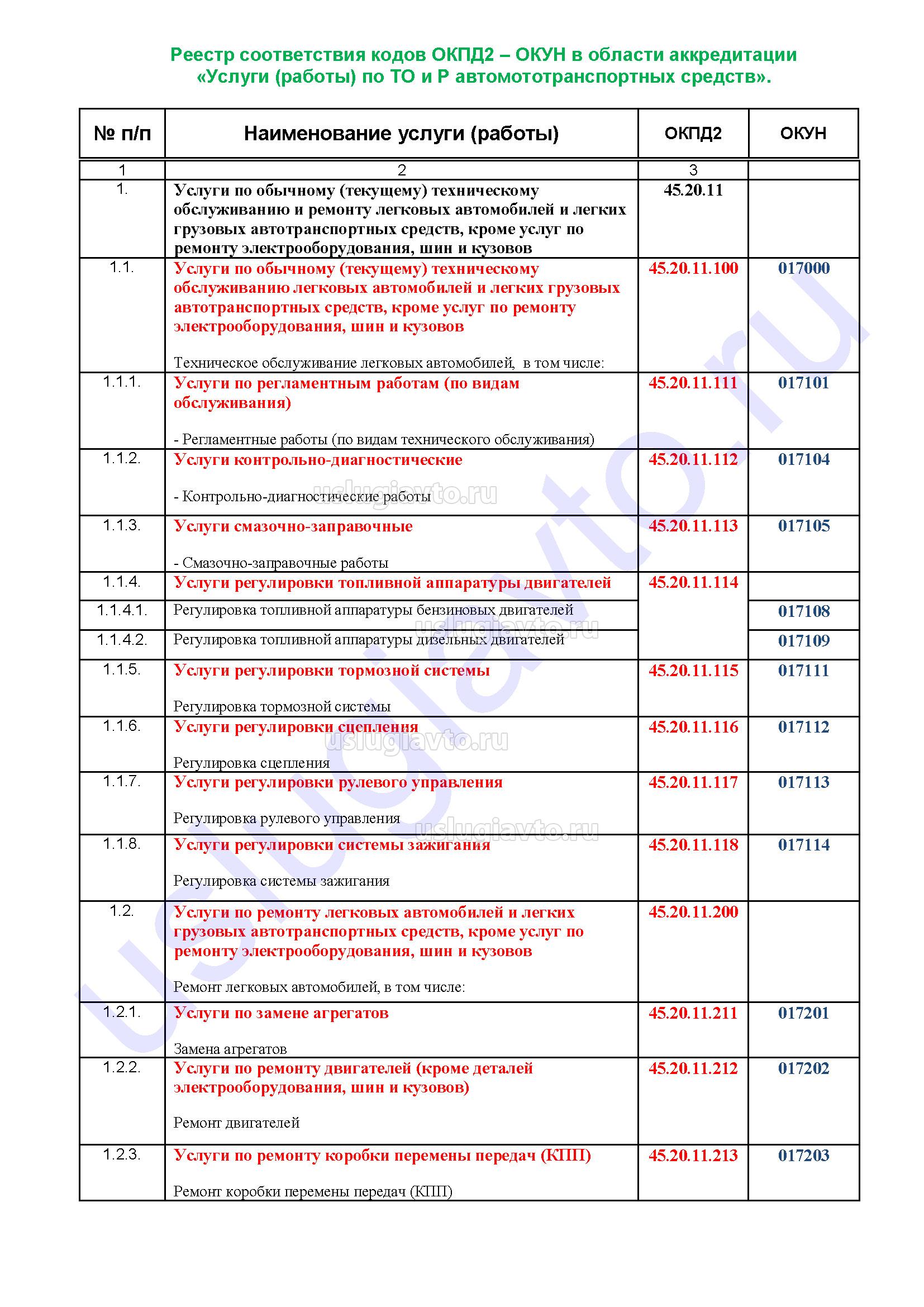 Реестр соответствия кодов ОКПД2 и ОКУН в Области аккредитации по Техническому обслуживанию и ремонту автомототранспортных средств.