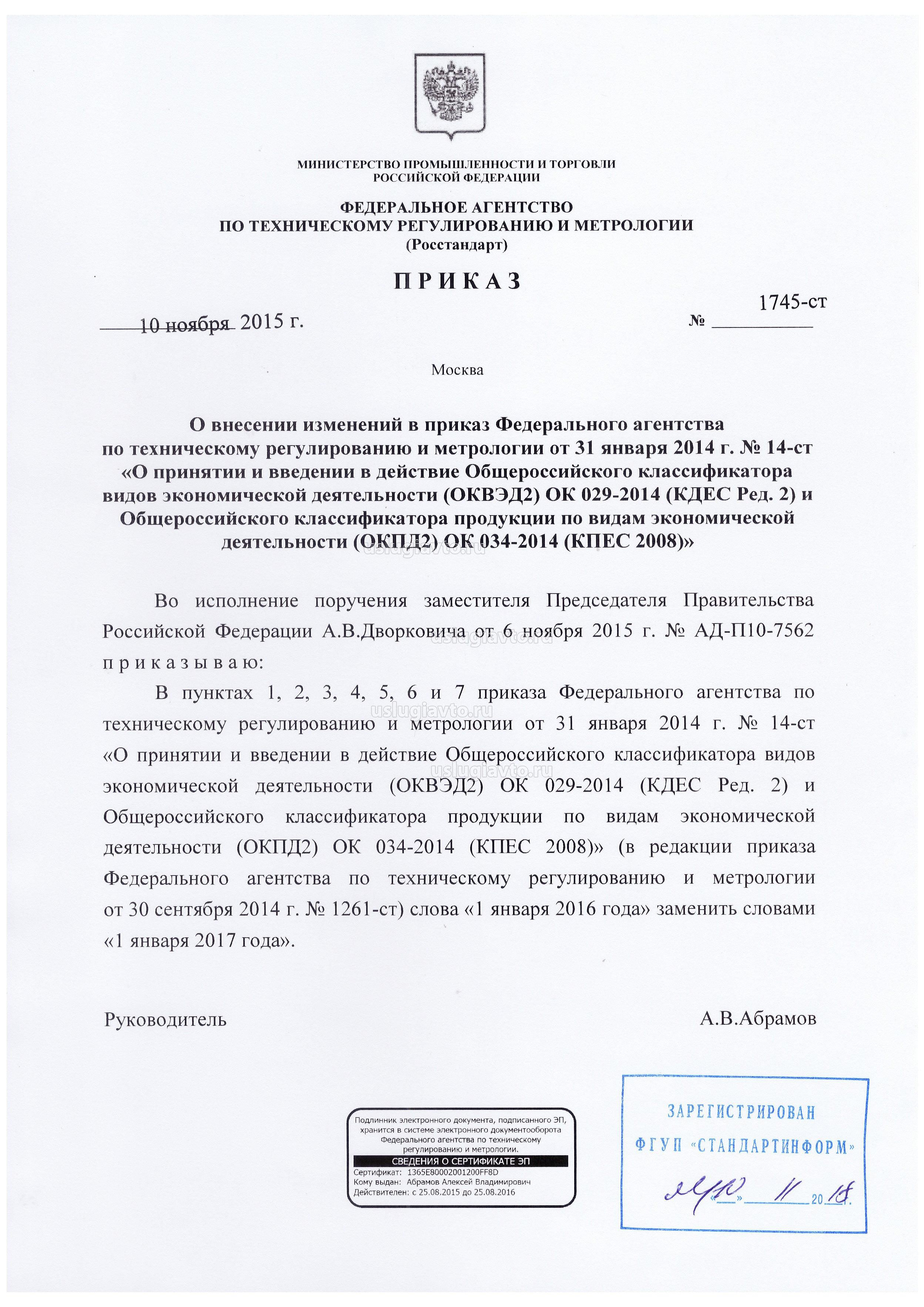 ОКПД 2 начнет свое действие с 01.01.2017 года, об этом сказано в приказе Федерального агентства по техническому регулированию и метрологии (Росстандарта) от 10.11.2015 номер 1745.