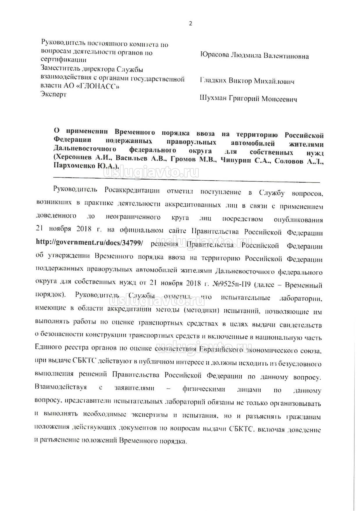 http://government.ru/docs/34799/ решения Правительства Российской Федерации об утверждении Временного порядка ввоза на территорию Российской Федерации поддержанных праворульных автомобилей жителями Дальневосточною федерального округа для собственных нужд от 21 ноября 2018 г. №9525п-П9 (далее - Временный порядок). Руководитель Службы отметил, что испытательные лаборатории, имеющие в области аккредитации методы (методики) испытаний, позволяющие им выполнять работы по оценке транспортных средствах в целях выдачи свидетельств о безопасности конструкции транспортных средств и включенные в национальную част ь Единого реестра органов но оценке соответствия Евразийского экономического союза, при выдаче СБКТС действуют в публичном интересе и должны исходить из безусловного выполнения решений Правительства Российской Федерации по данному вопросу. Взаимодействуя с заявителями - физическими лицами по данному вопросу, представители испытательных лабораторий обязаны не только opорганизовывать и выполнять необходимые экспертизы и испытания, но и разъяснять гражданам положения действующих документов по вопросам выдачи СБКТС. включая доведение и разъяснение положений Временного порядка.