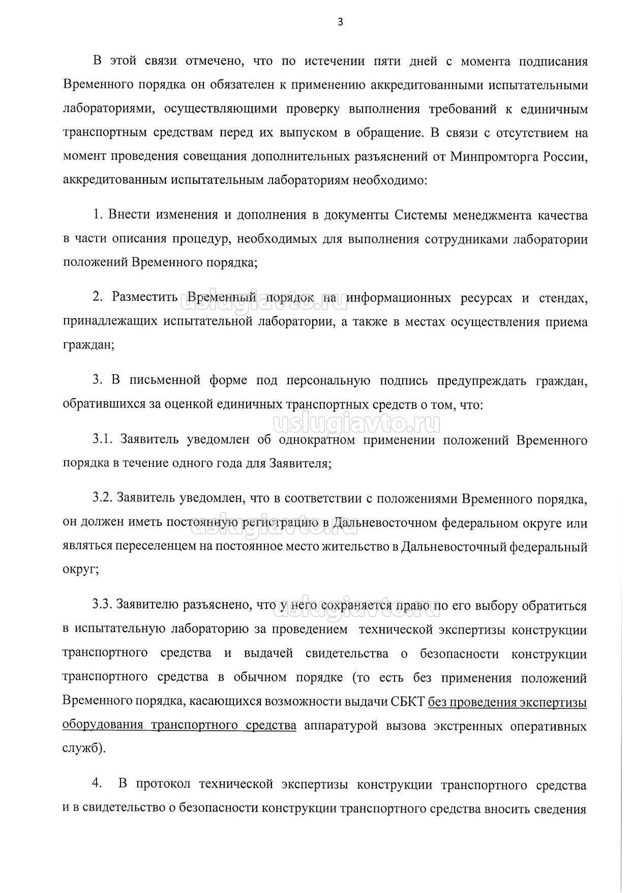 3.3. Заявителю разъяснено, что у него сохраняется право по его выбору обратиться в испытательную лабораторию за проведением технической экспертизы конструкции транспортного средства и выдачей свидетельства о безопасности конструкции транспортного средства в обычном порядке (то есть без применения положений Временного порядка, касающихся возможности выдачи СБКТ без проведения экспертизы оборудования транспортного средства аппаратурой вызова экстренных оперативных служб).