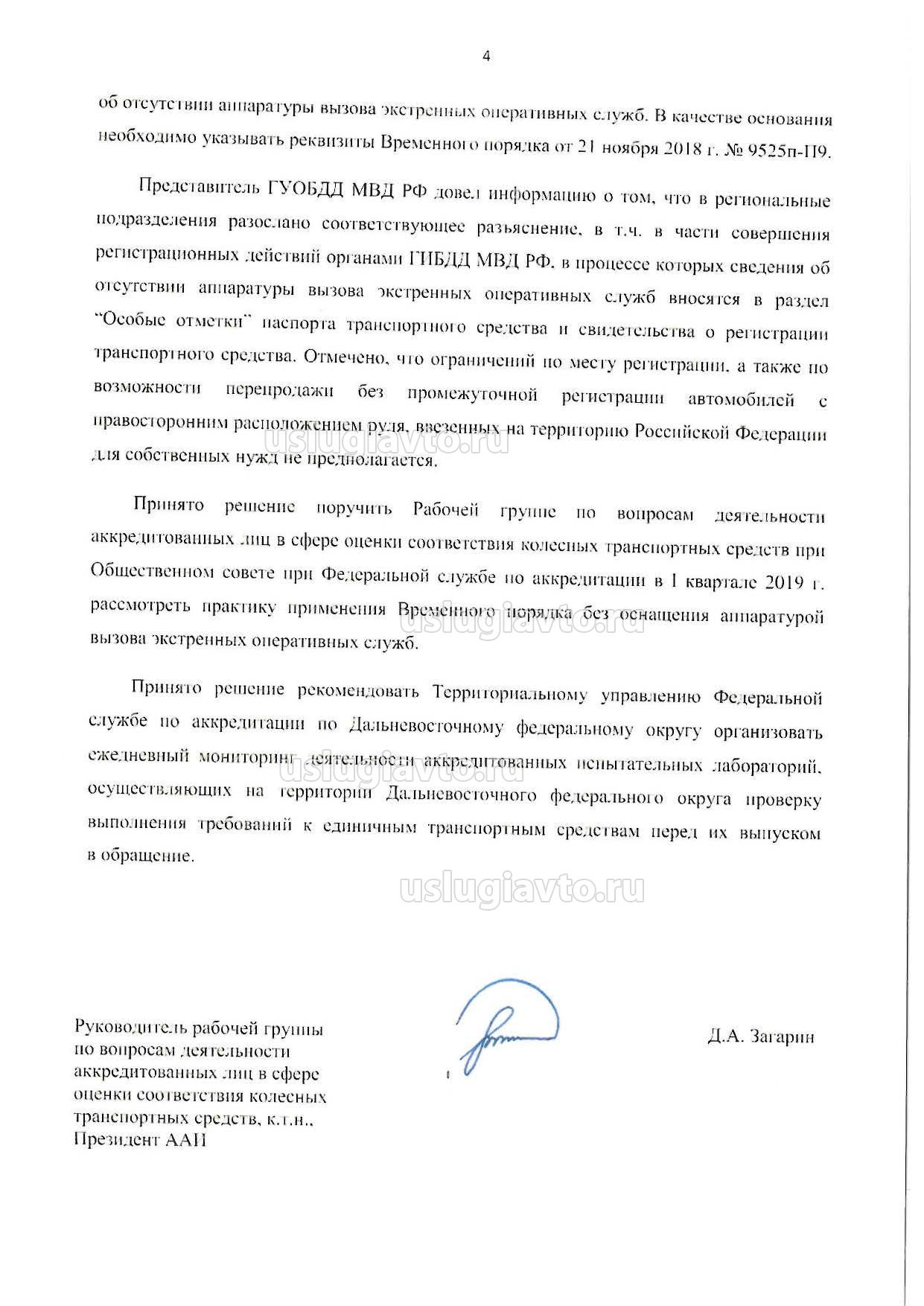 4. В протокол технической экспертизы конструкции транспортного средства и в свидетельство о безопасности конструкции транспортного средства вносить сведения об oотсутствии аппаратуры вызова экстренных оперативных служб. В качестве основания необходимо указывать реквизиты Временною порядка от 21 ноября 2018 г. №9525п-П9.