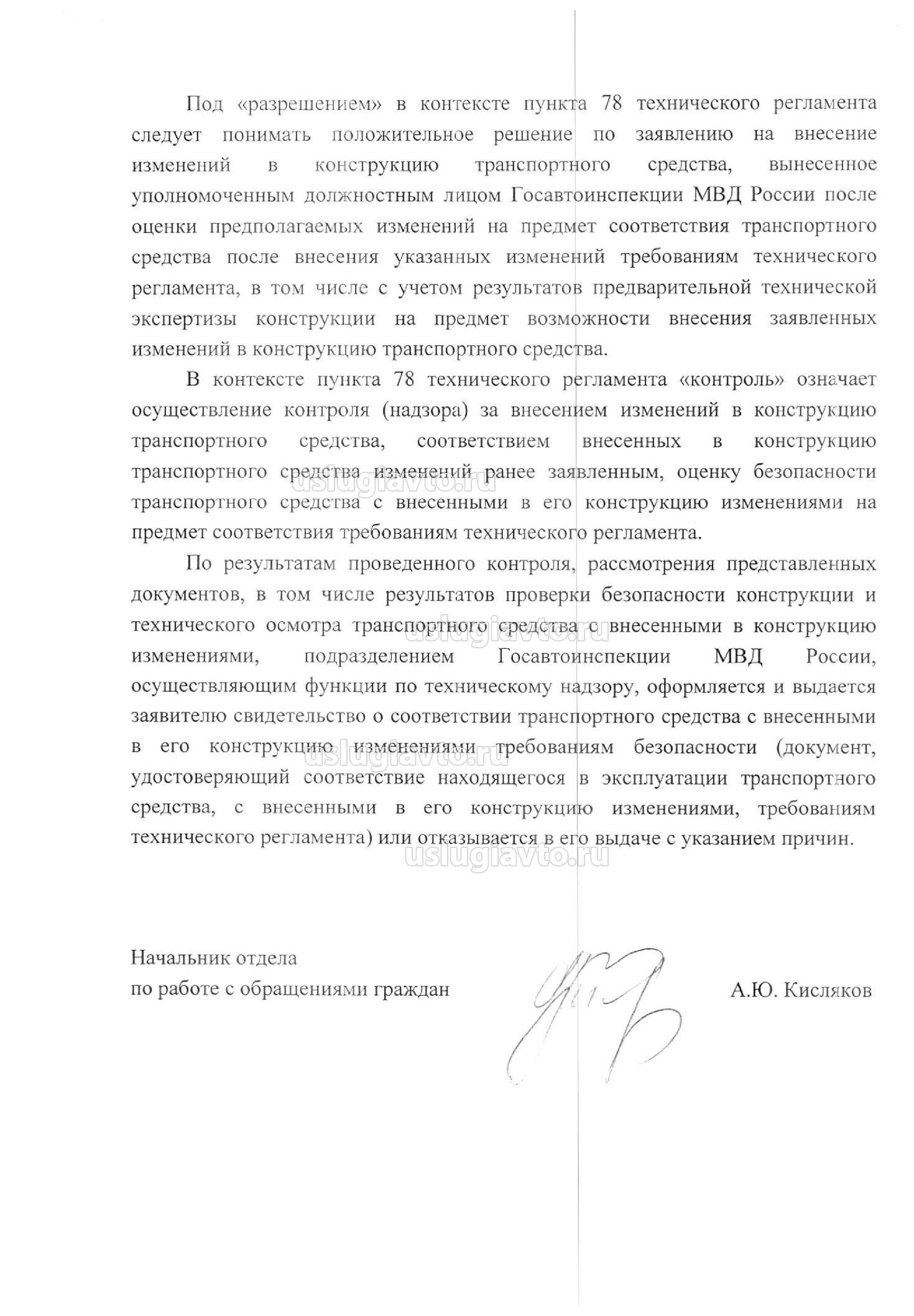 Под «разрешением» в контексте пункта 78 технического регламента следует понимать положительное решение по заявлению на внесение изменений в конструкцию транспортного средства, вынесенное уполномоченным должностным лицом Госавтоинспекции МВД России после оценки предполагаемых изменений на предмет соответствия транспортного средства после внесения указанных изменений требованиям технического регламента, в том числе с учетом результатов предварительной технической экспертизы конструкции на предмет возможности внесения заявленных изменений в конструкцию транспортного средства.