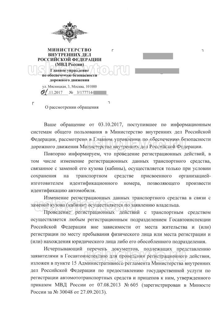Информируем, что проведение регистрационных действий, в том числе изменение регистрационных данных транспортного средства, связанное с заменой его кузова (кабины), осуществляется только при условии сохранения на транспортном средстве присвоенного организацией-изготовителем идентификационного номера, позволяющего произвести идентификацию автомобиля. Изменение регистрационных данных транспортного средства в связи с заменой кузова (кабины) осуществляется по заявлению владельца. Проведение регистрационных действий с транспортным средством осуществляется любым регистрационным подразделением Госавтоинспекции Российской Федерации вне зависимости от места жительства и (или) регистрации по месту пребывания физического лица или места регистрации и (или) нахождения юридического лица либо его обособленного подразделения. Исчерпывающий перечень документов, подлежащих представлению заявителями в Госавтоинспекцию для проведения регистрационного действия, изложен в пункте 15 Административного регламента Министерства внутренних дел Российской Федерации по предоставлению государственной услуги по регистрации автомототранспортных средств и прицепов к ним, утвержденного приказом МВД России от 07.08.2013 № 605 (зарегистрирован в Минюсте России за № 30048 от 27.09.2013). Обращаем Ваше внимание, что изменение регистрационных данных транспортного средства, связанное с внесением изменений в конструкцию зарегистрированного транспортного средства, производится на основании свидетельства о соответствии транспортного средства с внесенными в его конструкцию изменениями требованиям безопасности. Одновременно информируем, что согласно положениям технического регламента Таможенного союза «О безопасности колесных транспортных средств», утвержденного решением Комиссии Таможенного союза от 09.12.2011 № 877, к понятию «внесение изменений в конструкцию транспортного средства» относится исключение предусмотренных или установка не предусмотренных конструкцией конкретного транспортного средства составных частей и предметов оборудования, выполненные после выпуска транспортного средства в обращение и влияющие на безопасность дорожного движения. В случае, если установка указанного в обращении оборудования предусмотрена одобрением типа транспортного средства или инструкцией (руководством) по эксплуатации автомобиля разработанной заводом-изгоговителем, то монтаж такого оборудования не является внесением изменений в конструкцию транспортного средства, и не требует оформления свидетельства о соответствии транспортного средства с внесенными в его конструкцию изменениями требованиям безопасности. Вопрос об отнесении замены на зарегистрированном в установленном порядке транспортном средстве кузова (кабины) к внесению изменений в его конструкцию может быть разрешен по результатам рассмотрения конкретных документов при изменении регистрационных данных транспортного средства, связанном с заменой его кузова (кабины).