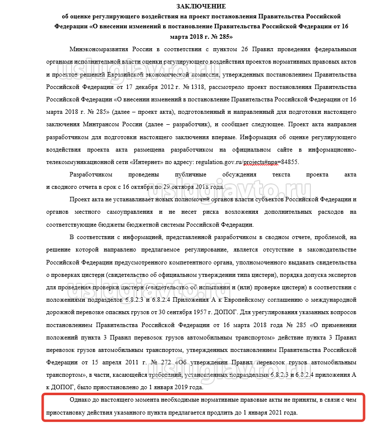 В целях распределения полномочий между федеральными органами исполнительной власти по реализации приложений ДОПОГ Минтрансом России в мае 2018 года был подготовлен и направлен для согласования в заинтересованные федеральные органы исполнительной власти проект постановления Правительства Российской Федерации «О реализации требований приложений А и В к Европейскому соглашению о международной дорожной перевозке опасных грузов и о внесении изменения в Положение о Министерстве транспорта Российской Федерации». В связи с имеющимися принципиальными противоречиями различных федеральных органов исполнительной власти, возникшими при согласовании указанного проекта постановления и связанными с определением федерального органа, уполномоченного выдавать свидетельства о проверках цистерн и допускать экспертов к проведению испытаний в соответствии с требованиями ДОПОГ, а также учитывая что подготовка порядка допуска, допуск лабораторий и организация их работы потребует дополнительного времени, необходимо применение положений пункта 3 Правил перевозок грузов автомобильным транспортом в части, касающейся требований, установленных подразделами 6.8.2.3 и 6.8.2.4 ДОПОГ, отложить до 1 января 2021 года с внесением соответствующих изменений в постановление Правительства Российской Федерации от 16 марта 2018 г. № 285 «О применении пункта 3 Правил перевозок грузов автомобильным транспортом»