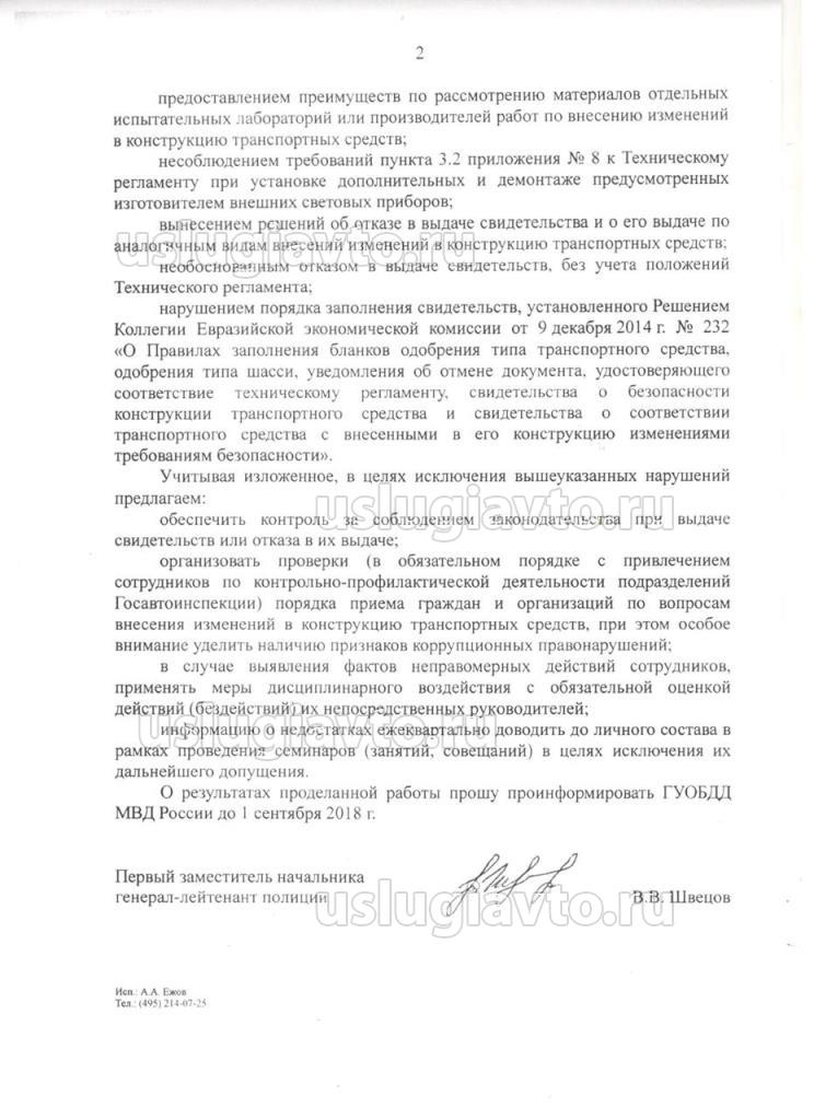 Учитывая изложенное, в целях исключения вышеуказанных нарушений предлагаем: обеспечить контроль за соблюдением законодательства при выдаче свидетельств или отказа в их выдаче: организовать проверки (в обязательном порядке с привлечением сотрудников по контрольно-профилактической деятельности подразделений Госавтоинспекции) порядка приема граждан и организаций по вопросам внесения изменений в конструкцию транспортных средств, при этом особое внимание уделить наличию признаков коррупционных правонарушений: в случае выявления фактов неправомерных действий сотрудников, применять меры дисциплинарного воздействия с обязательной оценкой действий (бездействий) их непосредственных руководителей; информацию о недостатках ежеквартально доводить до личного состава в рамках проведения семинаров (занятий, совещаний) в целях исключения их дальнейшего допущения. О результатах проделанной работы прошу проинформировать ГУОБДД МВД России до 1 сентября 2018 г.