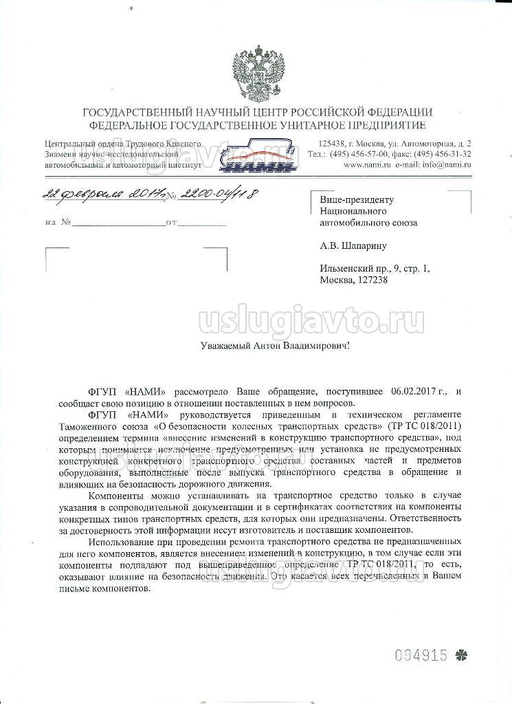 ФГУП «НАМИ» рассмотрело Ваше обращение, поступившее 06.02.2017 г., и сообщает свою позицию в отношении поставленных в нем вопросов. ФГУП «НАМИ» руководствуется приведенным в техническом регламенте Таможенного союза «О безопасности колесных транспортных средств» (ТР ТС 018/2011) определением термина «внесение изменений в конструкцию транспортного средства», под которым понимается исключение предусмотренных или установка не предусмотренных конструкцией конкретного транспортного средства составных частей и предметов оборудования, выполненные после выпуска транспортного средства в обращение и влияющих на безопасность дорожного движения. Компоненты можно устанавливать на транспортное средство только в случае указания в сопроводительной документации и в сертификатах соответствия на компоненты конкретных типов транспортных средств, для которых они предназначены. Ответственность за достоверность этой информации несут изготовитель и поставщик компонентов. Использование при проведении ремонта транспортного средства не предназначенных для него компонентов, является внесением изменений в конструкцию, в том случае если эти компоненты подпадают под вышеприведенное определение ТР ТС 018/2011, то есть, оказывают влияние на безопасность движения. Это касается всех перечисленных в Вашем письме компонентов. При проведении ремонта транспортного средства рекомендуется использовать одобренные его изготовителем компоненты. Это условие обеспечивается при проведении ремонта на авторизованных изготовителем транспортного средства предприятиях. Принимая решение об установке на транспортное средство иных компонентов, следует руководствоваться имеющейся на них документацией. Если в ней приведены сведения о том, что указанные компоненты предназначены для установки на интересующее транспортное средство, то факт внесения изменений в конструкцию такого транспортного средства отсутствует. В случае внесения изменений в конструкцию транспортного средства применяются положения пунктов 75-80 ТР ТС 018/2011, в том числе, требуется проведение технического осмотра транспортного средства. В настоящий момент не существует документа, в котором бы приводились сведения о том, что транспортное средство после проведения ремонта находится в технически исправном состоянии. Заключение о технически исправном состоянии транспортного средства может быть сделано по результатам технического осмотра.