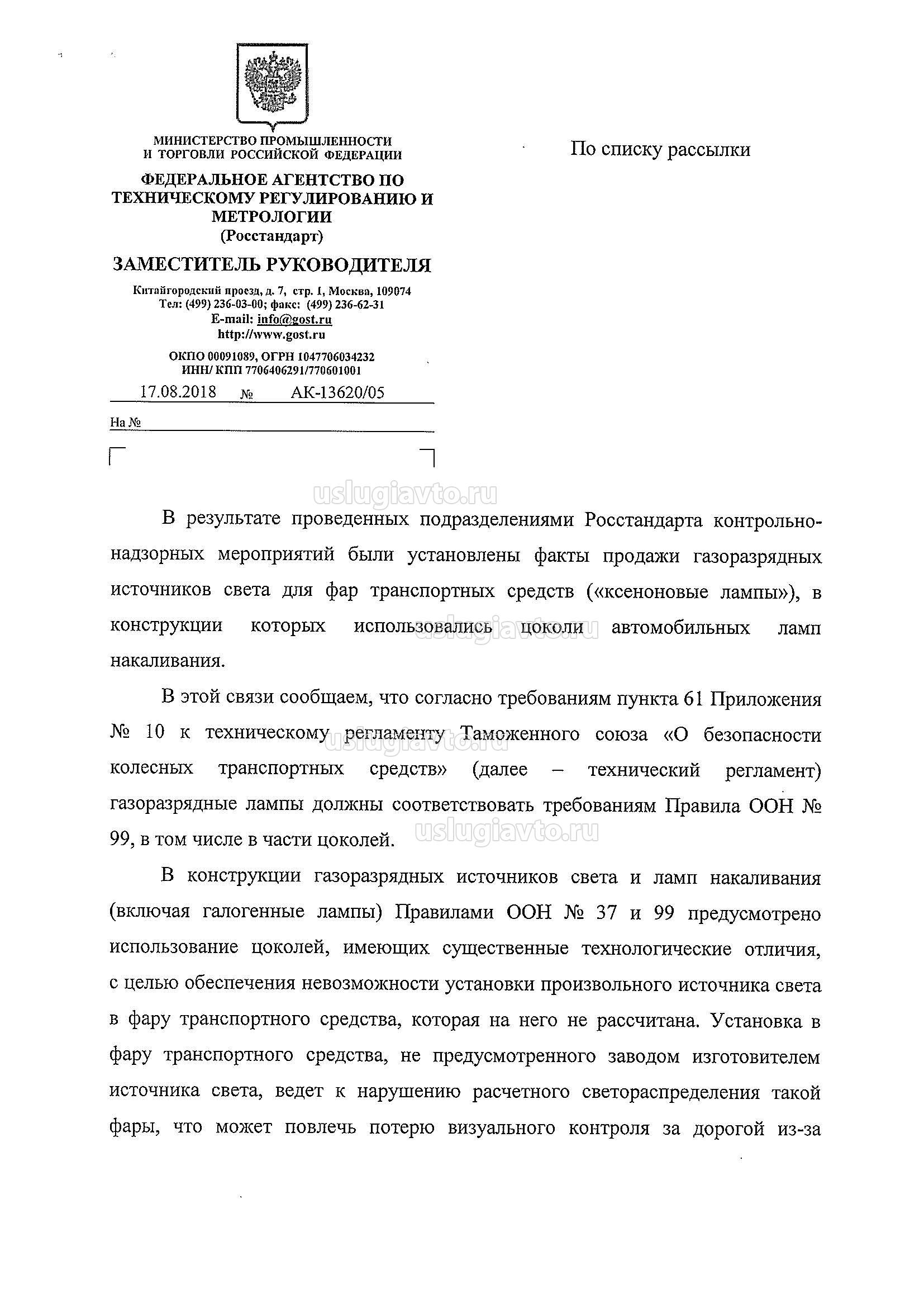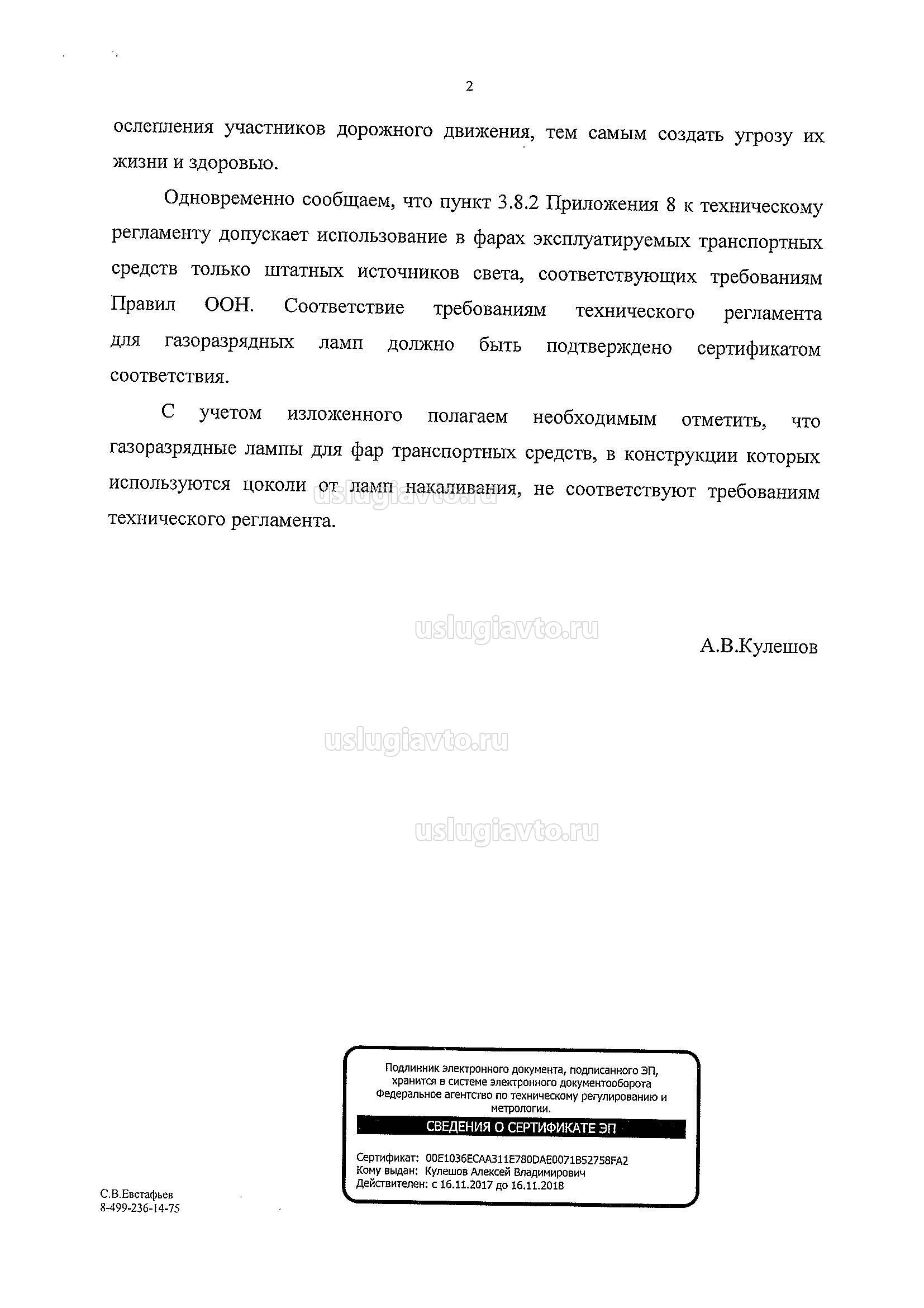 В результате проведенных подразделениями Госстандарта контрольно-надзорных мероприятий были установлены факты продажи газоразрядных источников света для фар транспортных средств («ксеноновые лампы»), в конструкции которых использовались цоколи автомобильных ламп накаливания. В этой связи сообщаем, что согласно требованиям пункта 61 Приложения № 10 к техническому регламенту Таможенного союза «О безопасности колесных транспортных средств» (далее - технический регламент) газоразрядные лампы должны соответствовать требованиям Правила ООН № 99, в том числе в части цоколей. В конструкции газоразрядных источников света и ламп накаливания (включая галогенные лампы) Правилами ООН № 37 и 99 предусмотрено использование цоколей, имеющих существенные технологические отличия, с целью обеспечения невозможности установки произвольного источника света в фару транспортного средства, которая на него не рассчитана. Установка в фару транспортного средства, не предусмотренного заводом изготовителем источника света, ведет к нарушению расчетного светораспределения такой фары, что может повлечь потерю визуального контроля за дорогой из-за ослепления участников дорожного движения, тем самым создать угрозу их жизни и здоровью. Одновременно сообщаем, что пункт 3.8.2 Приложения 8 к техническому регламенту допускает использование в фарах эксплуатируемых транспортных средств только штатных источников света, соответствующих требованиям Правил ООН. Соответствие требованиям технического регламента для газоразрядных ламп должно быть подтверждено сертификатом соответствия. С учетом изложенного полагаем необходимым отметить, что газоразрядные лампы для фар транспортных средств, в конструкции которых используются цоколи от ламп накаливания, не соответствуют требованиям технического регламента.